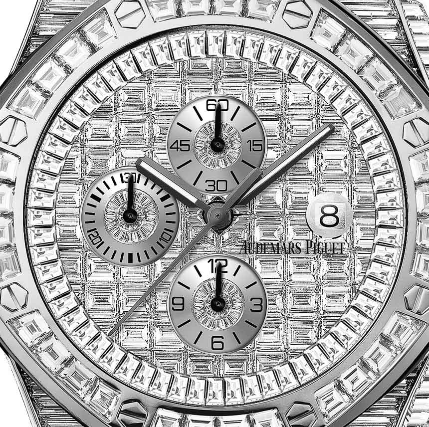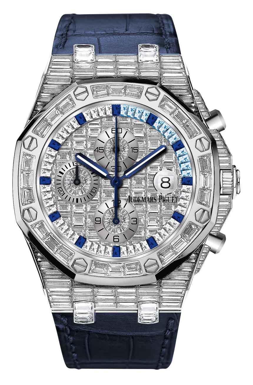 這些全密鑲手表均采用 18k 白金表殼,表殼上鑲嵌了多達(dá)幾十克拉的鉆石。Audemars Piguet Royal Oak Offshore Chronograph 44mm 表殼和表鏈上鑲嵌了 53 克拉的寶石,表盤(pán)上鑲嵌了 6.53 克拉的寶石。那是近 60 克拉的鉆石和數(shù)百顆長(zhǎng)方形切割鉆石。不幸的是,這款和其他皇家橡樹(shù)離岸型手表的珠寶版本將表殼的防水性能更改為僅 20 米。在這種情況下,您可能想稱(chēng)它為“Royal Oak Onshore”。