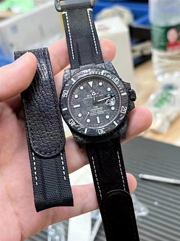 VS廠開款的DIW碳纖維水鬼,手表是碳纖維材料。碳釬焊材料是一種新的應用材料,顏色是永不過時的黑色,整體紋理非常優雅,紋理多變,就像“世界上沒有完全相同的葉子”由于切割方式不同,每一塊碳纖維腕表都會表現出不同的紋理,成為獨一無二的存在。