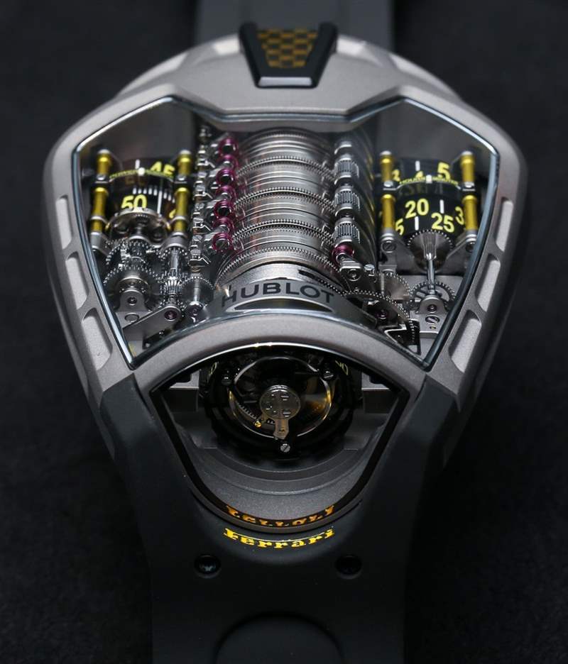 Hublot 設計了 ??Hublot MP-05 LaFerrari 手表內部的機芯 – 這是品牌“Masterpiece”系列(因此稱為“MP”)的一部分 – 大致類似于實際 LaFerrari 汽車的發動機艙 – 限量版法拉利看起來很漂亮壯觀(而且很可能完全售罄)。從字面上看,機芯主要是發條,而位于中心的許多發條盒是其性能的關鍵。堆棧的下端是一個陀飛輪式擒縱機構,它垂直放置,可通過表殼底部的窗口看到。廣告留言廣告信息結束