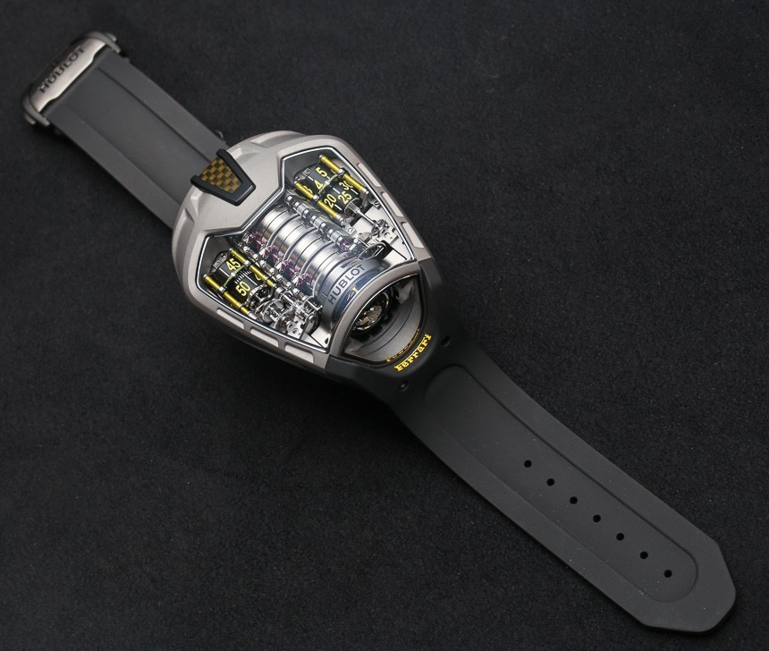 操作 Hublot MP-05 LaFerrari 是另一項獨特的嘗試。該表殼沒有表冠或任何類型的調節器。事實上,要給手表上弦或設置時間,您需要輔助設備。我們在去年的原始 LaFerrari 手表文章(鏈接到上面)中有一張它的照片。它是宇舶表隨附的電鉆式工具。它連接到表殼頂部的端口,用于設置時間或為機芯上弦。為什么要用電鉆?好吧,否則用手上弦會花費太長時間!
