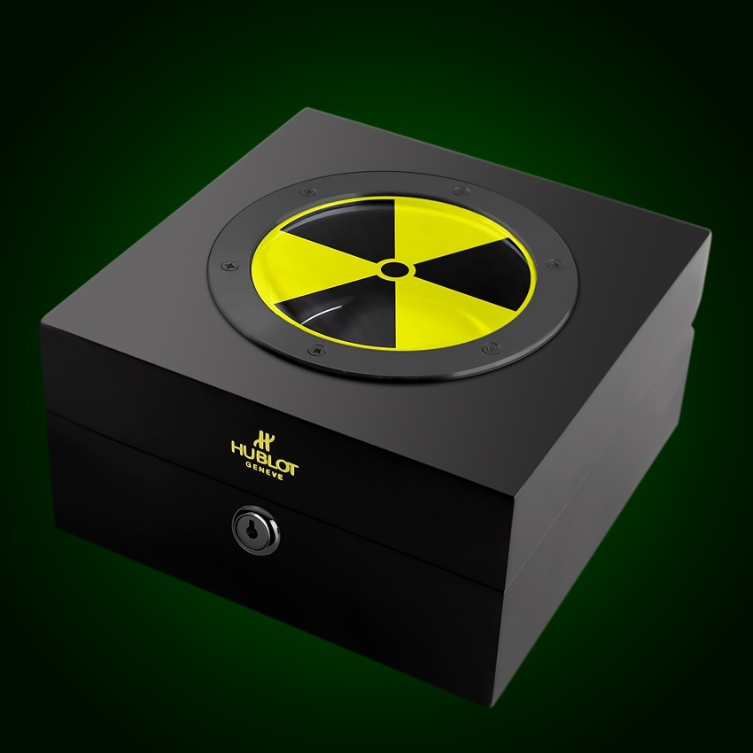 Hublot 決定將 Atomic D-38 基于其新的 45 毫米寬更新 Big Bang 表殼,并開發一種特別適合手表放射性特性的獨特復雜功能。Hublot 理解,甚至建議訂購 Atomic D-38 的顧客不要一直佩戴它。事實上,就像陳年烈酒一樣,一次只能喝少量。當 Big Bang Atomic D-38 腕表不使用時,宇舶表提供了一個鉛質展示盒,用于存放未佩戴的腕表,以保護兒童和動物的生命安全。