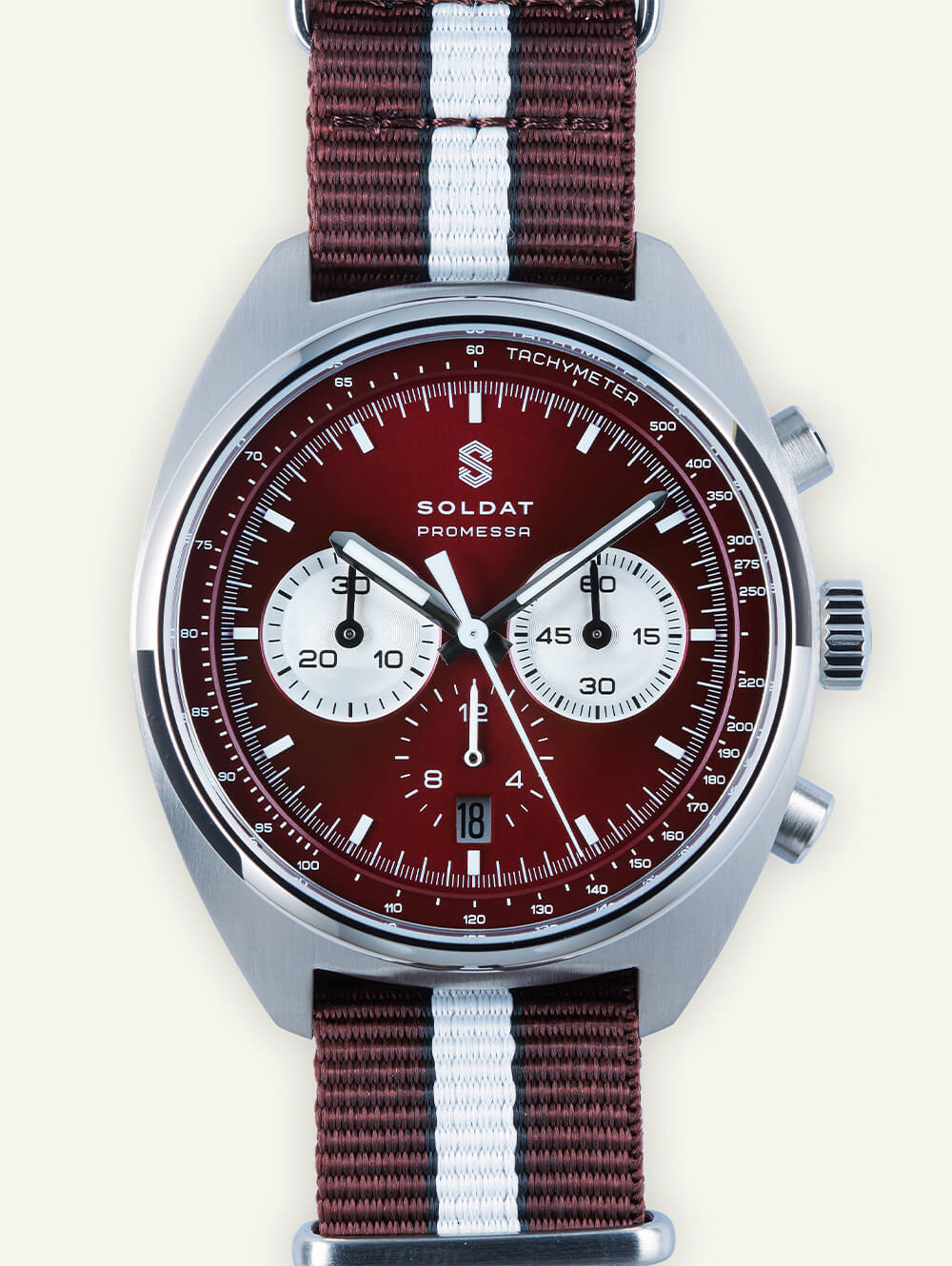 正是這三款腕表首次將這位鐘表企業家帶入了復古腕表的世界,而在推出 Soldat 時,他的第一款腕表也很好地遵循了相同的路線,尤其是 Heuer 1153 腕表。結果就是 Soldat Promessa。
