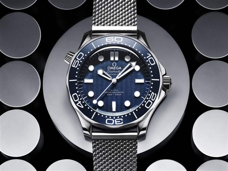 海馬系列300米潛水表42毫米至臻天文臺(tái)表詹姆斯·邦德60周年紀(jì)念腕表鋼殼鋼鏈款。同樣為了慶祝007系列電影上映60周年而推出,表殼尺寸為42毫米,采用不銹鋼材質(zhì)打造,藍(lán)色表盤(pán)以草酸陽(yáng)極氧化鋁制成,飾以激光鐫刻波紋圖案,靈感源自詹姆斯·邦德在1995年上映的電影《黃金眼》(Golden Eye)中所佩戴的海馬系列300米潛水表。潛水刻度上的傳統(tǒng)倒三角標(biāo)志則以數(shù)字「60」取代,別具紀(jì)念意義。該表搭配經(jīng)過(guò)拉絲處理的精鋼網(wǎng)狀表鏈,為其金屬外觀增添紋理質(zhì)感,呼應(yīng)邦德在電影《無(wú)暇赴死》(No Time To Die)中佩戴的鈦金屬表所搭配的優(yōu)雅網(wǎng)狀表鏈,比較少見(jiàn)而別致。