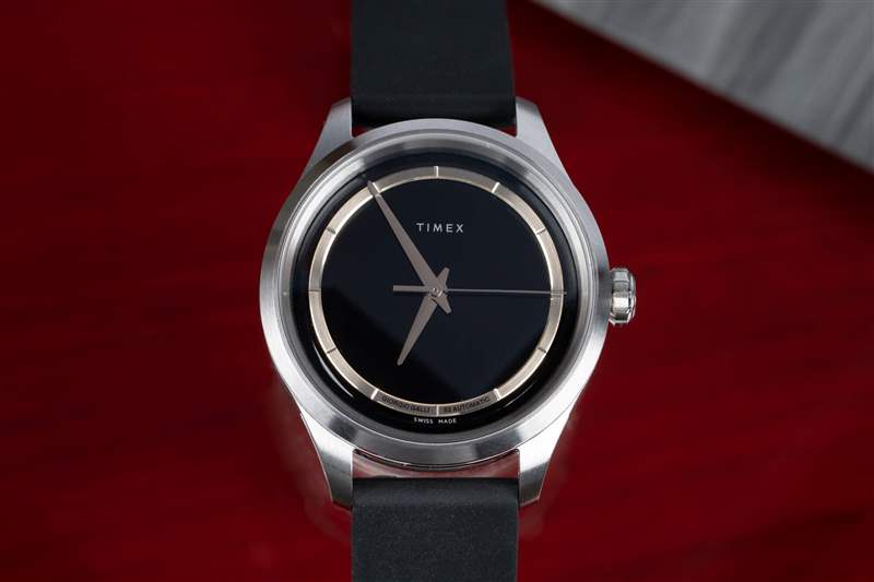我認為 Timex 和 Giorgio Galli 真正在表盤上表現出色。之前的表盤,其旭日紋飾面非常吸引人,但仔細一看,它就分崩離析了,微小的切口邊緣粗糙,指針扁平,造型也拿不定主意。不過,Giorgio Galli S2 的整體審美已經發生了變化。最初的表盤很難決定它是正裝還是運動,而這款表盤則牢牢地扎根于前者的復雜領域。黑色幾乎是不可能的黑色,以至于我想知道 Timex 是否已經破產并使用了Vantablack。縞瑪瑙琺瑯有輕微的光澤,但大多只是保持那種漆黑的顏色,讓其他元素真正流行起來。