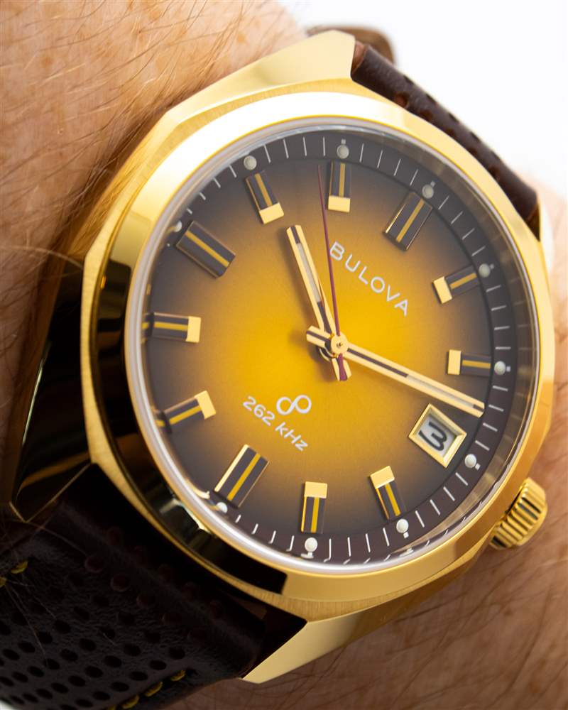 雖然 Bulova Jet Star 的表盤布局可能相對簡單,但正是這種簡單設(shè)計的執(zhí)行使表盤脫穎而出。不銹鋼型號有深梅洛紅或限量版銀色可供選擇,但我們的金色評測型號配備了豐富、時髦的“奶油糖果”表盤配色。與傳統(tǒng)的明亮黃金色調(diào)不同,這款略帶紋理的旭日紋表盤以接近純蜂蜜顏色的近乎琥珀色色調(diào)開始。由于表盤的漸變效果,外部分鐘刻度逐漸變成深巧克力棕色,從而在表盤上呈現(xiàn)出美妙的暖色調(diào)。它一點也不微妙,就像巴里·吉布 (Barry Gibb) 身上的聚酯纖維西裝一樣,大約是 70 年代的風(fēng)格,但這帶來了自己品牌的引人注目的魅力。簡單的條紋棒形指針和配套的棕色涂層立體時標避免了這種外觀過于復(fù)雜的情況,并牢牢地植根于其 70 年代祖先的背景,旁邊的 12 點鐘位置印有老式 Bulova 標志。一些純粹主義者可能會對 3 點鐘窗口使用白色日期輪表示不滿,但這在很大程度上也是正確的。稍微偏離表盤感覺的是紅色針秒針。這款指針每秒 16 次的流暢掃描與通常每秒一次的石英秒針相比是一個有趣的變化,但紅色調(diào)可以說太亮又太柔和,不適合真正的設(shè)計。雖然黑色或深棕色秒針可以干凈利落地融入整體調(diào)色板,寶路華 (Bulova) 的紅色顏色太暗、太柔和,無法真正形成有效的對比效果。更具活力的猩紅色很可能解決這個難題,同時保持當(dāng)前風(fēng)格不變。