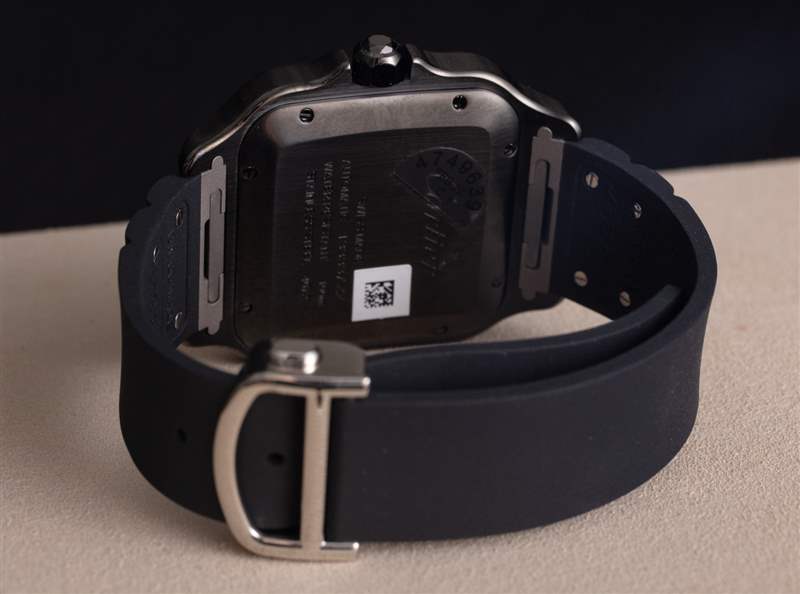 當然,這并不是表盤元素也是黑色的意義上的“全黑”手表。卡地亞通過將表針和羅馬數字時標涂上白色夜光來確保 Santos WSSA0039 也清晰易讀。與上一代 Santos 100 Carbon 上的運動型紅色秒針不同,這款黑色 Santos 的單色個性以今天的標準來說更加時尚和現代。表殼和橡膠表帶螺絲采用拋光鋼制成,為手表增添了一點卡地亞風格。效果是讓它們稍微捕捉到光線,從而更好地吸引眼睛到手表上。因此,您有隱形手表的外觀,盡管這款 Santos 非常引人注目。表冠上有一顆黑色尖晶石凸圓形寶石。