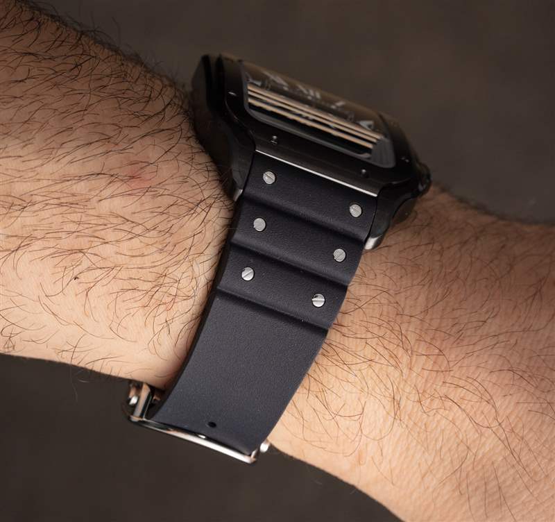 通過卡地亞的易調節 (QuickSwitch) 表帶更換系統連接到表殼上的是一個適合表殼的啞光黑色鱷魚皮表帶,以及圖中的黑色橡膠表帶(在折疊展開式表扣上非常舒適)。手表內部是品牌內部廣泛使用的內部制造的 1847 MC 自動機芯,其工作頻率為 4Hz,具有約兩天的動力儲存。