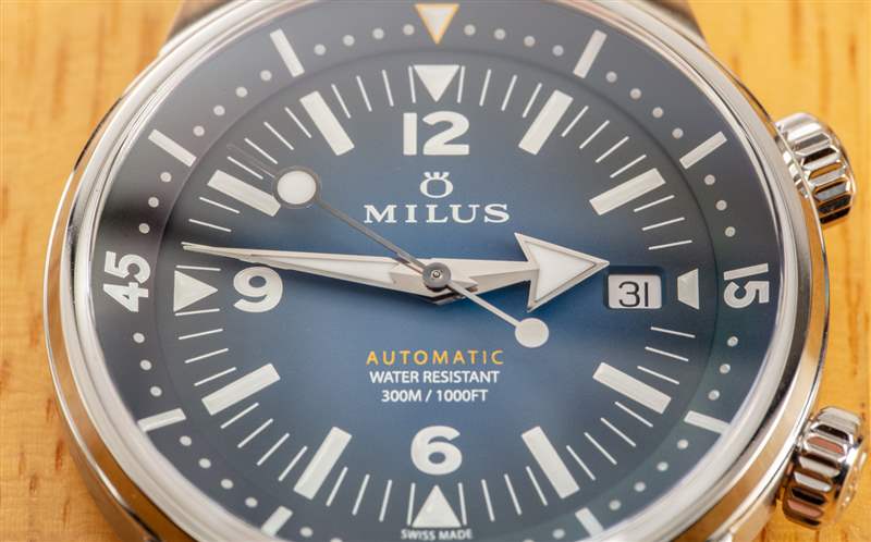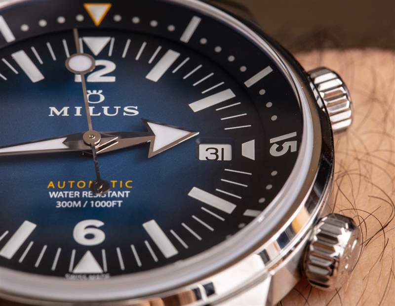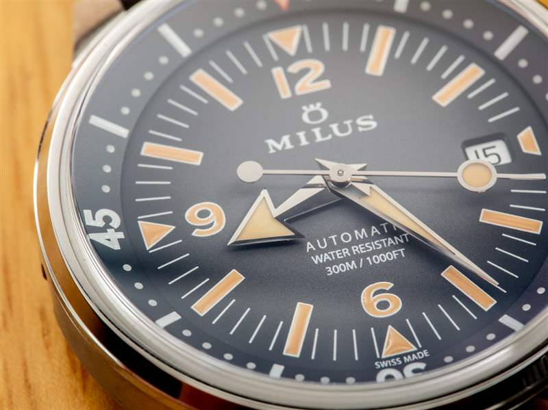 Milus Archimedes 表盤上沒有多少原創(chuàng)感,但這是手表最強大的部分,有助于增加其性感魅力。我真的很喜歡手,既清晰又拋光。這些形狀使它們脫穎而出,它們是寬箭頭式時針,太妃分針和大橄欖棒秒針。表盤標記上涂有豐富的夜光漆,并且肯定具有復古潛水表的氛圍。臉部本身有一點顏色漸變,正如您在圖片中看到的那樣,Milus 目前提供 Milus Archimedes Blue 和 Milus Archimedes Black。具有諷刺意味的是,阿基米德黑主要是棕色,而米盧斯阿基米德藍中的黑色比黑色更多。我將它們重命名為 Archimedes Dark & Stormy 和 Archimedes Depth Blue。