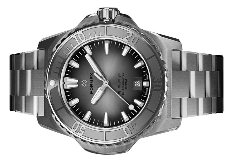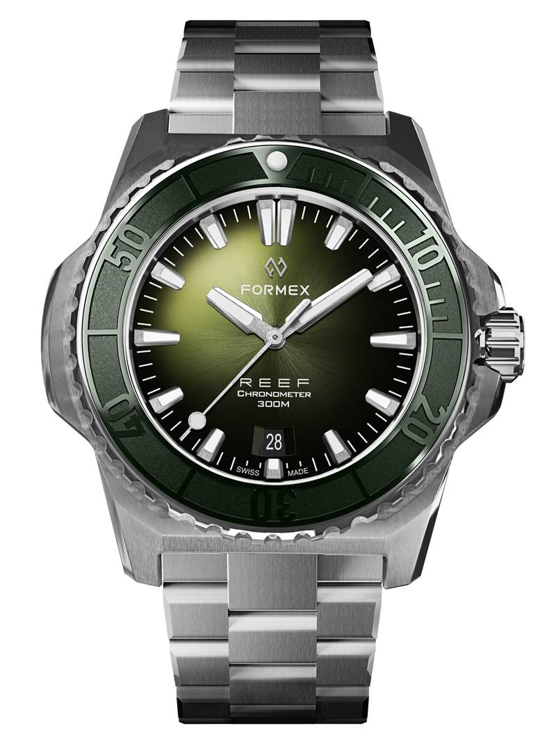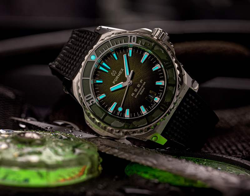 說(shuō)到表盤(pán),每款 REEF 手表都有一個(gè)經(jīng)過(guò)太陽(yáng)光線拋光的表面,采用類似于汽車面板涂漆的特殊技術(shù),由手工精心噴涂而成。這使用多層和仔細(xì)的油漆量來(lái)創(chuàng)造豐富、一致的外觀。可用的表盤(pán)顏色包括深藍(lán)、海洋黑、珊瑚綠或漸變銀色。表盤(pán)設(shè)計(jì)本身的靈感來(lái)自 Formex Essence,配備更強(qiáng)大的指針和時(shí)標(biāo),以在黑暗、潮濕的條件下提供最佳易讀性。在價(jià)格低于 2,000 美元的手表中通常不會(huì)發(fā)現(xiàn)這種工藝水平,但像 Formex 這樣的瑞士制造品牌開(kāi)始改變這一點(diǎn)。