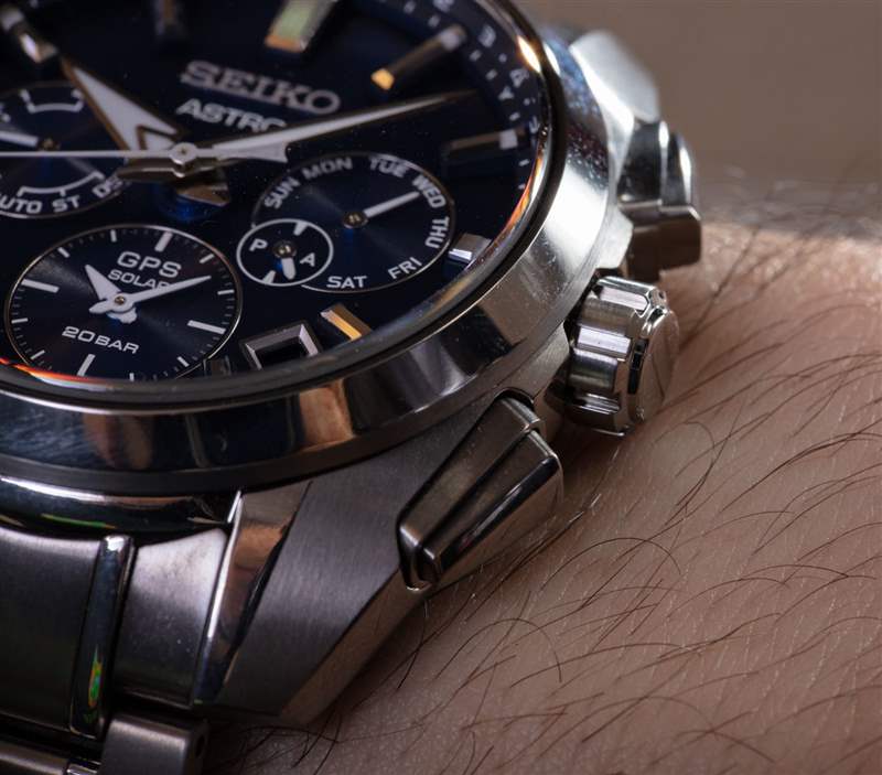 所有 Seiko Astron GPS Solar 5X 手表均使用精密加工的鈦或鋼表殼。大約一半的型號(hào)配備陶瓷表圈(各種顏色),但只有服部金太郎限量版有切面陶瓷表圈。表盤(pán)上方是一個(gè)圓頂且令人印象深刻的 AR 涂層藍(lán)寶石水晶。只有一個(gè)型號(hào)(SSH024)帶有表帶,而且限量版 SSH023 有自己獨(dú)特的一組時(shí)標(biāo)和指針。最后,Astron GPS Solar 5X 手表的鈦金屬版本(這是本文拍攝的所有手表),有更有趣的角度推桿。