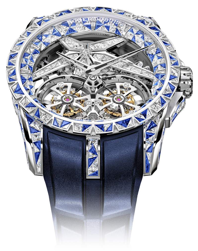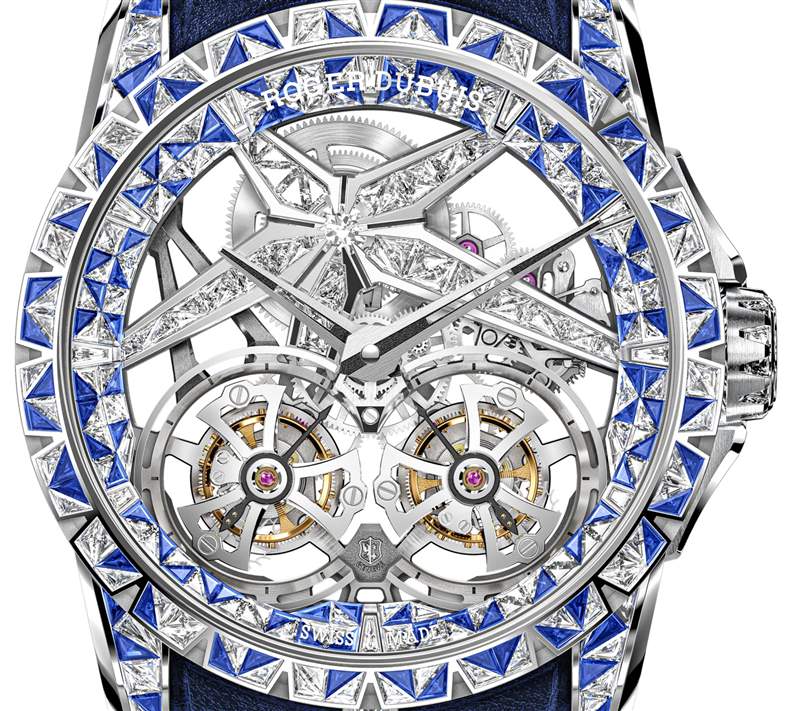 Excaliber Superbia 腕表寬 45 毫米(14.4 毫米厚,??防水深度達(dá) 100 米),采用 18k 白金 Excalibur 風(fēng)格表殼,交替鑲嵌四面體切割鉆石和深藍(lán)色藍(lán)寶石。腕表內(nèi)鑲嵌了 600 顆鉆石和藍(lán)寶石。Roger Dubuis 公開將手表描述為“相信生活不過是充分利用他人的游戲的一群人的終極圖騰”——換句話說,那些成功地(并且經(jīng)常令人震驚地)剝削他人的人。是的,當(dāng)這些人很容易被標(biāo)記時,它會很有幫助——比如使用獨一無二的藍(lán)色和白色閃閃發(fā)光的鐘表。羅杰杜彼通過幫助識別感興趣的人來幫助進(jìn)步的努力。看,在像瑞士這樣以公平為重點的社會中,每個人都會獲勝。