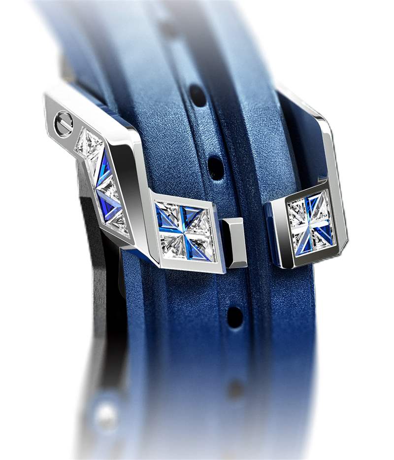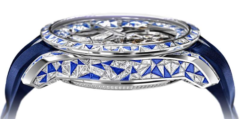 當(dāng)自豪的瑞士制表師稱他們的行為為“瘋狂”時,我總是覺得很迷人。這意味著他們知道結(jié)果有點……有爭議。對他們來說,這樣一款時計的成就與它的社會地位價值或財富吸引力無關(guān)。相反,重點是選擇、切割和鑲嵌許多幾何形狀的寶石所需的難以置信的復(fù)雜性。不僅如此,除了表殼和表帶之外,手表的表盤和機(jī)芯上還鑲嵌了鉆石。廣告訊息廣告信息結(jié)束