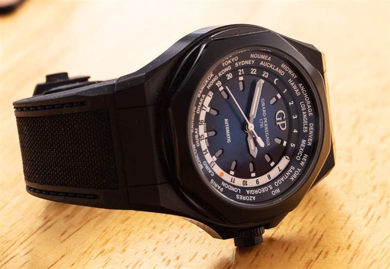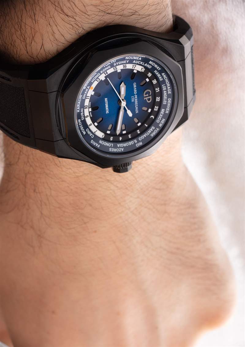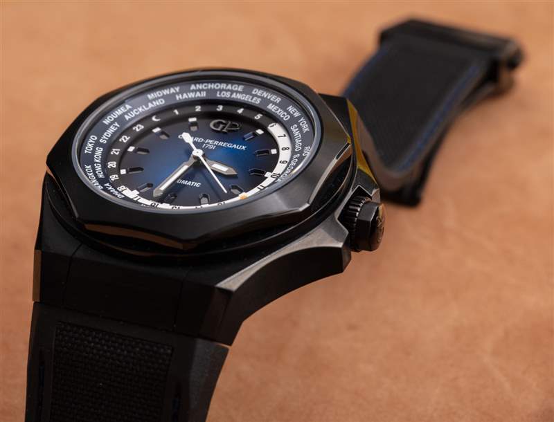 為 Laureato Absolute WW.TC 腕表提供動力的是內部制造的 Girard-Perregaux 機芯 GP03300-1056。自動機芯裝飾精美(不是你能看到的),工作頻率為 4Hz,具有 46 小時的動力儲存。合身的黑色橡膠表帶質量上乘,質地精美,設計令人愉悅。它帶有折疊式展開扣。表帶和搭扣沒有問題,但它們也沒有任何原創或突出之處。