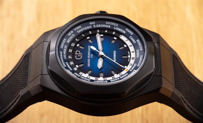 Laureato Absolute 有點奇怪,尤其是 Laureato Absolute WW.TC 版本,表盤本身比手表的整體直徑要窄得多。WW.TC 可能會進一步強調這一點,因為表盤的大部分都被用作參考城市環的內部旋轉表圈占據。這意味著讀取時間的有效表盤只有表殼整個頂部大小的大約 55%——與我估計的大多數手表相比,表圈占據了大約 5-15%外殼的表面積。也就是說,這類世界時間手表總是需要設計實際有效表盤相當窄的設計,因為必須設計城市環。廣告訊息廣告信息結束