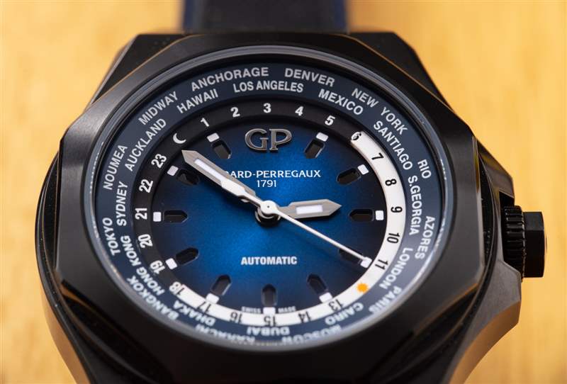 表盤本身實際上非常漂亮,采用金屬藍色制成,帶有凹陷的時標,增加了深度并很好地利用了光線。在它們上方是涂有夜光漆的標記。易讀性還可以,但如果基礎指針本身顏色較淺,則可能會有所改善。如果曾經有一種極簡主義的世界計時器表盤,那就是它。Girard-Perrgaux 偏愛對稱和簡潔,而不是復雜性,塞滿 Laureato Absolute WW.TC。這意味著表盤只有秒和世界時間24小時環的時間。該表還具有一個沒有按鈕的單表冠。要調整城市環,您必須將表冠擰到第一個位置,然后以與手動上鏈自動機芯相反的方式移動表冠。