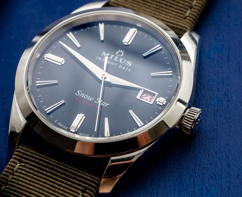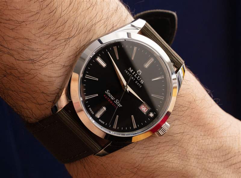 Snow Star Black 寬 39 毫米且相對纖薄,具有輕松通用的休閑外觀。它不會小到讓人感覺復古,也不會太大而不被認為是正式或正裝手表。Milus 喜歡將 Snow Star 定位為具有運動魅力的復古風格日常佩戴時計。這可以從品牌的營銷以及手表隨附的軍用色調橄欖綠色織物表帶中看出。表帶很好,但不是每個人都喜歡。它帶有快速釋放條,因此任何獲得這款手表的人都應該立即想到他們想在雪星上使用什么 20 毫米寬的表帶,以便為自己個性化。