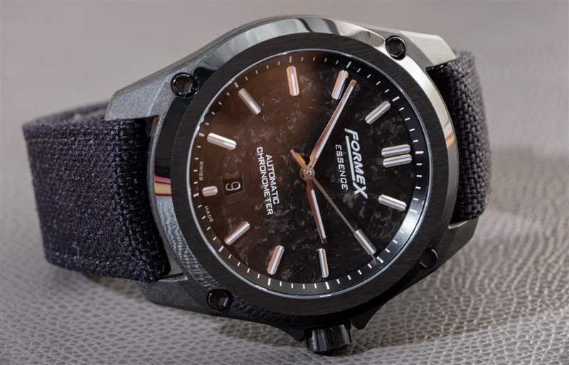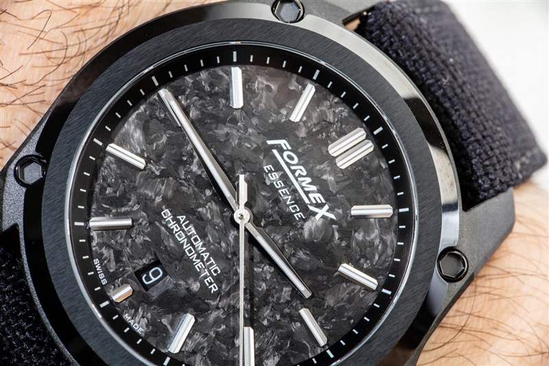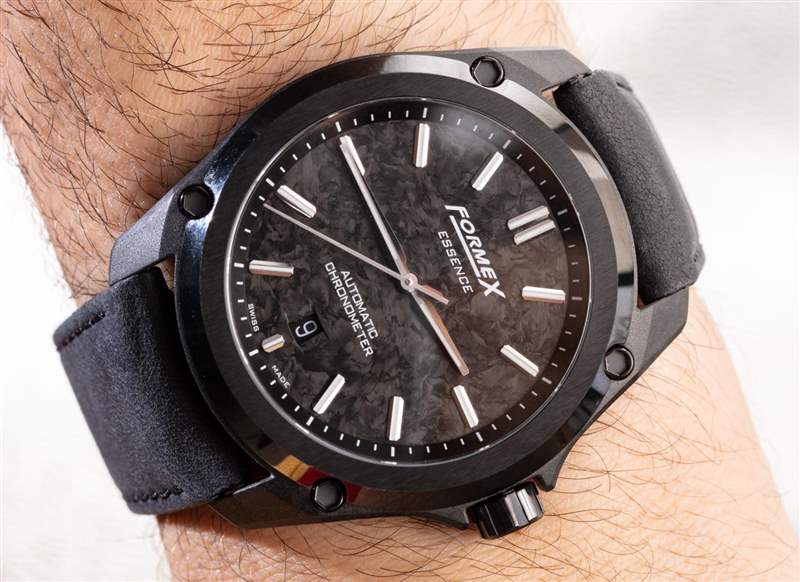 這也是獲得黑色手表的好方法。與其他具有有機紋理的鍛造碳材料不同,Essence Leggera 表殼非常均勻,按照工業(yè)標準“外觀完美”。它為手表注入了一種溫暖的有機感覺,Formex(對于這個特定版本的手表)使用了一個薄的鍛造碳表盤,當切割時,它具有更多的有機質感。其他版本的 Essence Leggera 有,例如,隕石表盤(用于 Essence Leggera Space Rock),以及更保守的表盤選項。我完全希望 Formex 在未來繼續(xù)使用 Essence Leggera 的各種美學變體。