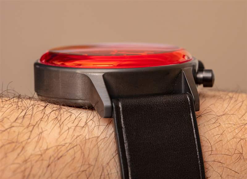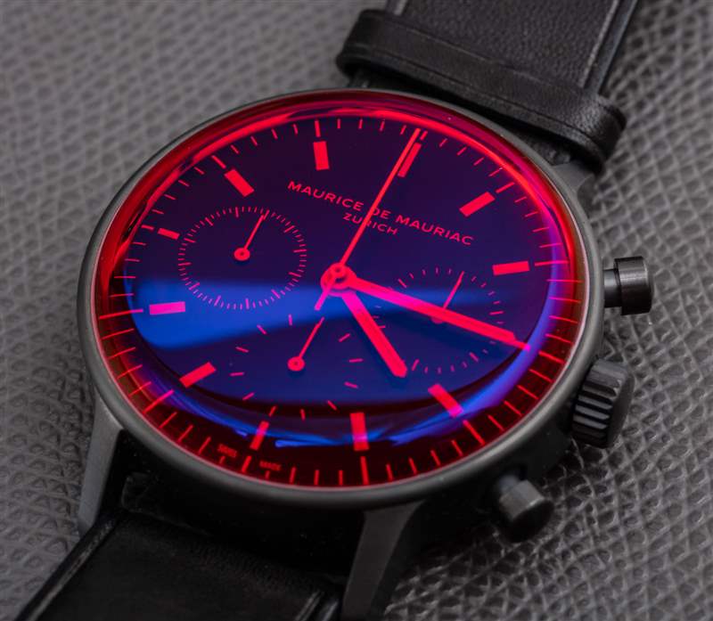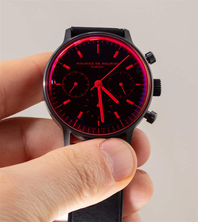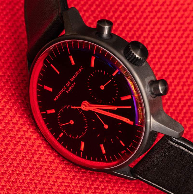 L3 Chronograph 表殼寬 40.5 毫米,厚約 13-14 毫米,表耳到表耳的距離約為 48 毫米,表帶的表耳寬度為 20 毫米。表殼防水僅為 30 米——不幸的是,這不是一款適合游泳的運動手表。這種特殊版本的精鋼表殼采用 DLC 涂層,呈現無煙煤色(不是完全黑色),使其外觀更光滑、更柔和,并與水晶完美搭配。說到紅水晶,我確實提到這是 Maurice de Mauriac 帶回的設計美學。2011 年,我在回顧Maurice de Mauriac Chronograph Modern Tactical Vision 手表時首次介紹了該品牌的這一非??岬内厔?。兩年后的 2020 年,我回顧了一款帶有紅水晶的手表,即Maurice de Mauriac Chronograph Modern Travel Timer.?事實上,就在莫里斯·德·莫里亞克 (Maurice de Mauriac) 透露這款今天首次亮相的帶有紅色水晶的 L3 計時碼表的幾周前,我問,“現在是時候帶回一些彩色水晶了嗎?”?看起來他們在那方面比我領先一點。