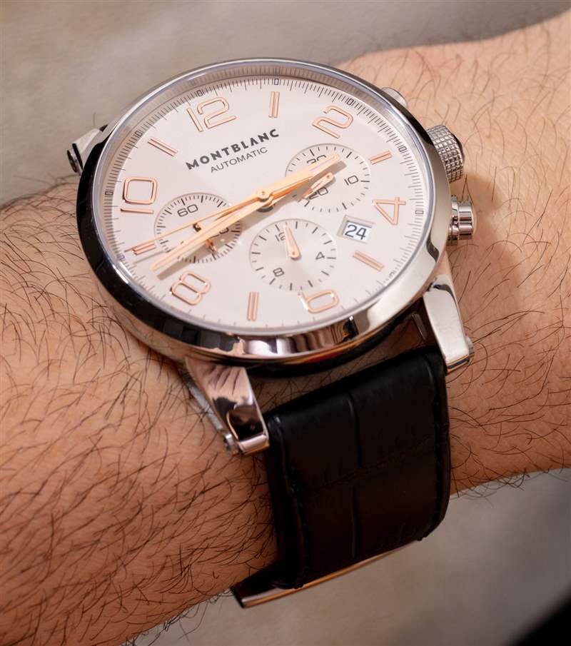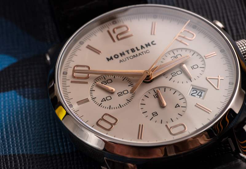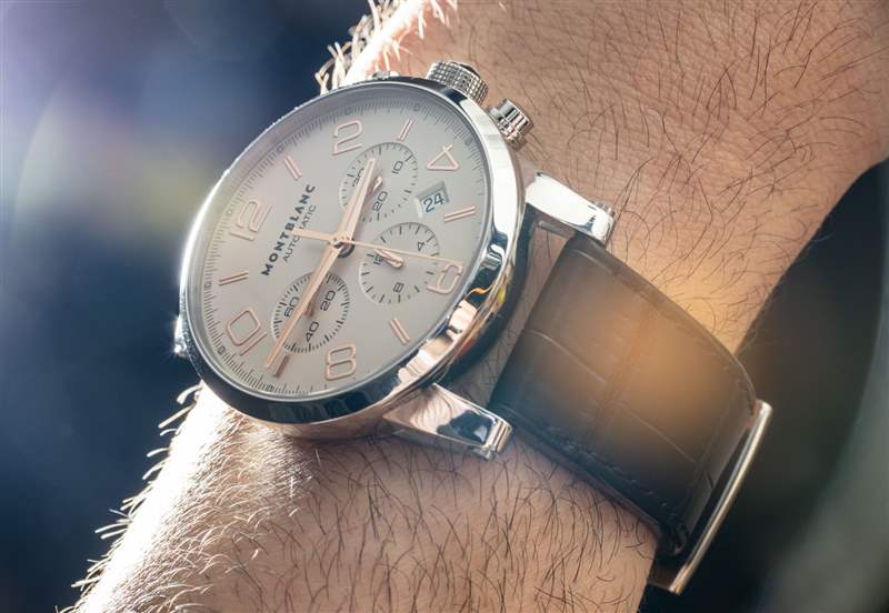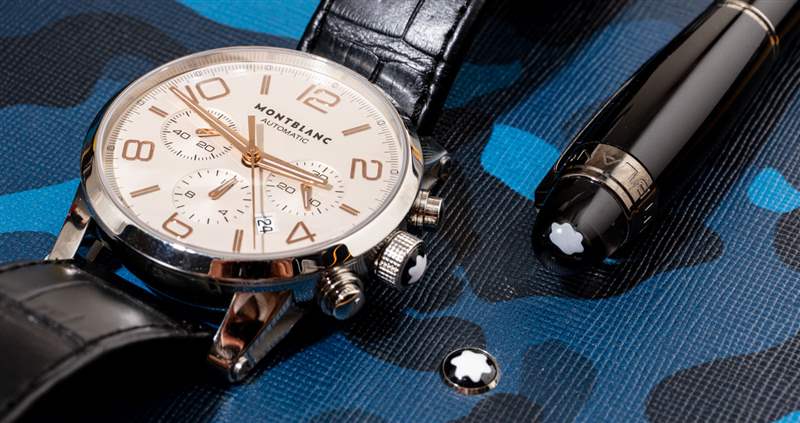 我年輕的手表愛好者迷戀沛納海式的佩戴身材和表盤的易讀性,但具有獨特的日耳曼風格,將挑釁性設計與包豪斯元素相結合。參考 101549 上的 Timewalker 計時碼表非常漂亮。它寬 43 毫米,大致呈碗形,帶有優雅的拱形表耳結構,同時也是鏤空的。為強調鏤空設計,表耳內部經過磨砂處理,與表殼其余部分的鏡面拋光形成鮮明對比。注意嵌入表冠的黑白萬寶龍山頂星星標志。