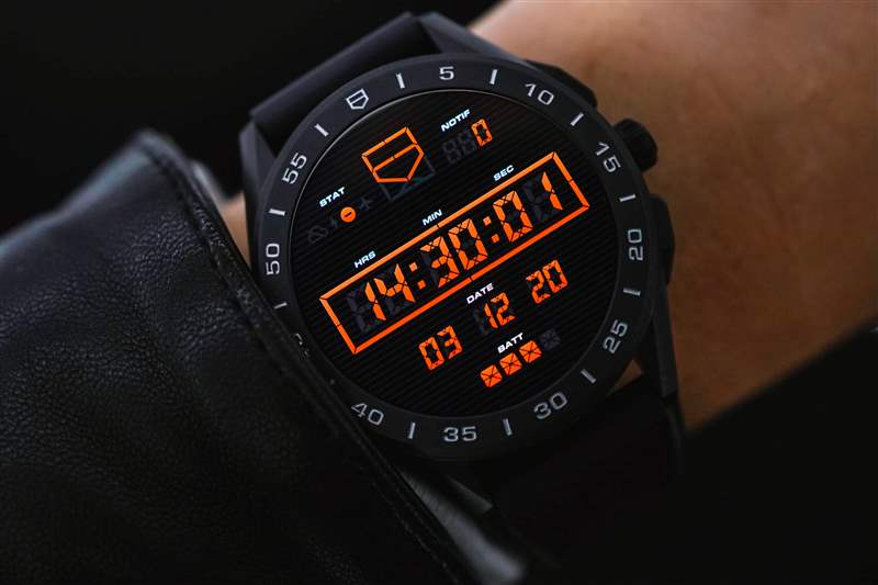 TAG Heuer Connected 智能手表預裝了一系列模擬和數字風格的“表盤”。每個人都有獨特的風格,總的來說,他們做得很好,沒有明顯的贏家。我確實喜歡 TAG Heuer 混合使用新概念以及制作相當精致的模擬表盤數字版本。該系統還支持常亮屏幕,它在“空閑”狀態下不會超亮,但足以讓佩戴者輕松閱讀(只是很難用相機拍攝)。與泰格豪雅交談,很明顯設計團隊將定期推出新的智能手表表盤,用戶可以通過泰格豪雅 Connected 應用程序下載這些表盤。