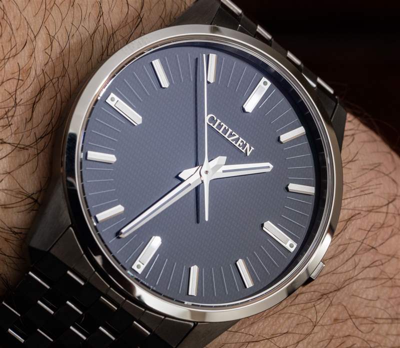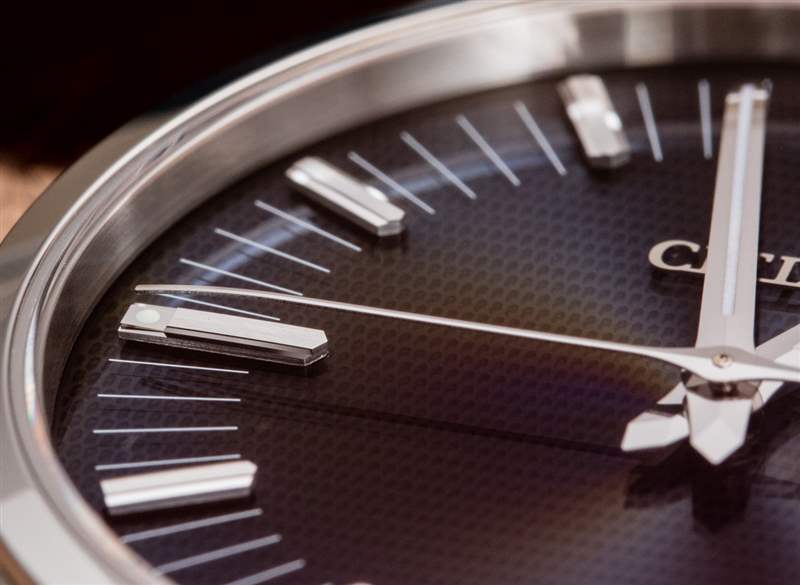 表盤設計本身很簡單,如果不是極簡的話。除了 6 點鐘位置的一些小文字外,Calibre 0100 表盤上唯一的文字是應用的 Citizen 徽標。大部分表盤專門用于鉆石拋光(也有拉絲部分)指針和匹配的時標。它們超平坦的拋光表面反射光線,帶來奢華感,但不會模糊光線,這會妨礙易讀性。表盤也有薄的、印刷的第二個指標,幾乎沒有別的。然而,表盤并非沒有細節。