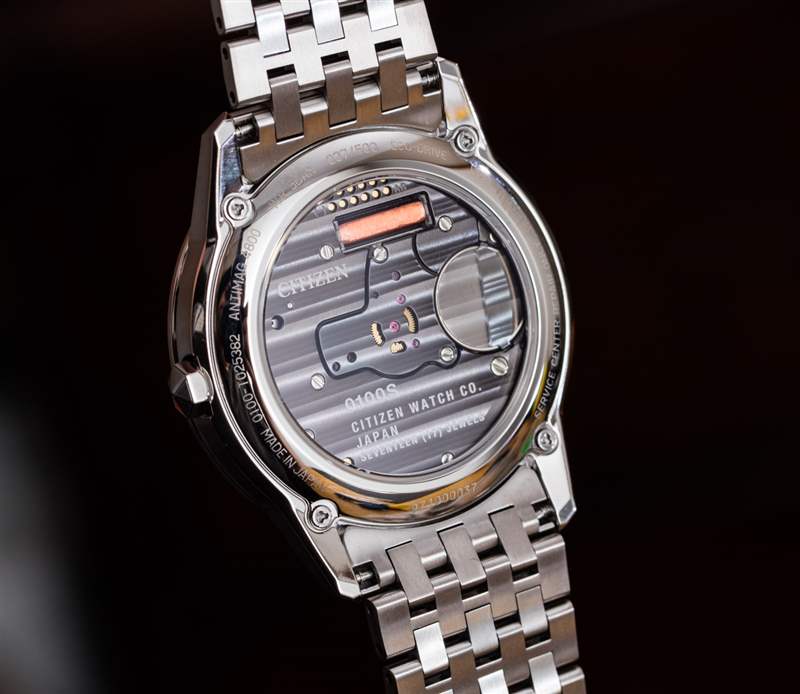 該機芯的設計不僅可以承載較重的秒針,而且還可以消除鞭打效應,這種效應會使較小的手表上的秒針在表盤上移動時“結結巴巴”,最終看起來很便宜。是的,Grand Seiko 9F 機芯也有這個功能,但西鐵城在幾個方面提升了它。每款 Calibre 0100 手表都是手工組裝的,組裝過程的一部分是秒針校準。Grand Seiko 做到了這一點,但據我所知,它不包括一個防震系統,可以重新調整可能已經搖晃不穩的手。這是卡西歐在其更高級的產品上也有的一個特點,現在西鐵城已經利用這個智能系統來保持 Calibre 0100 機芯多年來的精確運行。