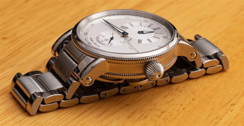 Chronoswiss 目前主要生產調節式表盤手表,并已將特定的儀表布局作為其品牌標識的關鍵部分。就價格、通用性和設計而言,Regulator Classic 之類的產品是其最全面的產品之一。上述設計實際上是傳統調節器式時鐘元素與復古飛行員風格表殼的結合。精鋼表殼的鑄造表圈和底蓋、大洋蔥式表冠和大表耳都是早期飛行員腕表的元素。Chronoswiss 將其與優雅的表鏈相結合,該表鏈通過略帶圓形的鏈節反映了表殼上的所有曲線。手鏈采用蝴蝶式展開式表扣閉合,鏈節中有一個半鏈節,可讓手鏈的尺寸更適合您的手腕。