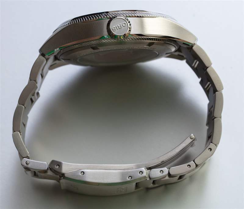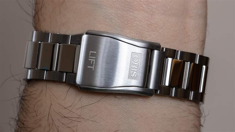 附在手表上的是一個三連桿錐形表鏈,與 ProPilot Big Date 的外觀相得益彰。我最喜歡的手鐲部分是展開式表扣。對于這款手表來說它并不是全新的,但對于 Oris 來說它是較新的,并且基于駕駛艙安全帶的打開系統(tǒng)。它不僅看起來很酷,而且操作起來很舒服。雖然我想象扣子可能會不時抓住東西,所以我想知道安全鎖是否有用。話雖如此,扣子從未在我身上打開過。否則手鐲相當(dāng)簡單直接。我覺得 Oris 可以設(shè)計一個微調(diào)系統(tǒng),或者至少提供一個半連桿。Oris Aquis 潛水表的表帶功能更強(qiáng)大,包括半鏈節(jié)、微調(diào)裝置和鏈節(jié)之間的螺絲桿。ProPilot Big Date 手鏈要簡單一些,