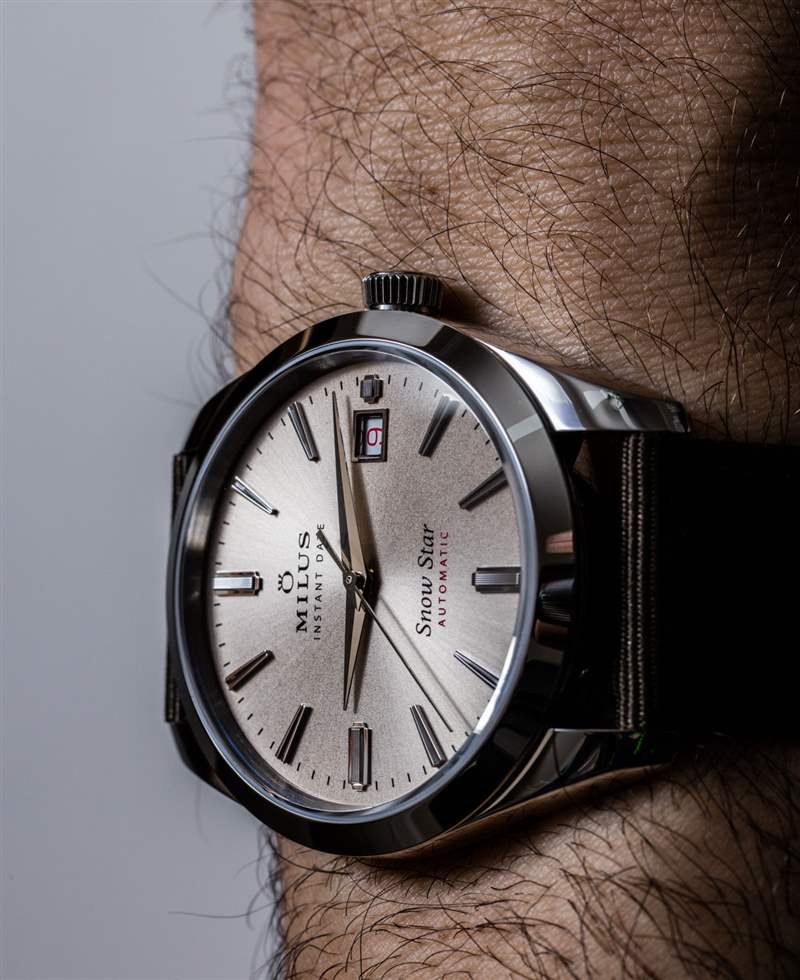 今天,Milus 提供銀色或黑色表盤的 Snow Star。(它實(shí)際上有一些黃色調(diào),所以看起來像“淡香檳”。)我推薦銀色表盤有兩個(gè)原因。首先,因?yàn)樘柟怙椕娴牧梁谏肀P與拋光指針搭配時(shí)會(huì)產(chǎn)生易讀性問題。其次,銀色表盤代表了歷史悠久的雪星手表的外觀。表盤采用迷人的太妃式指針和有趣的應(yīng)用時(shí)標(biāo),為原本保守的包裝增添了有趣且略帶時(shí)髦的元素。這里沒有發(fā)光體,但有一個(gè)帶有所有紅色數(shù)字的日期窗口。表盤上的標(biāo)記主要是指具有歷史意義的 Snow Star 系列(即時(shí)更改日期很重要)。總體來說,雪星表盤帥氣又經(jīng)典的風(fēng)格讓它非常時(shí)尚,