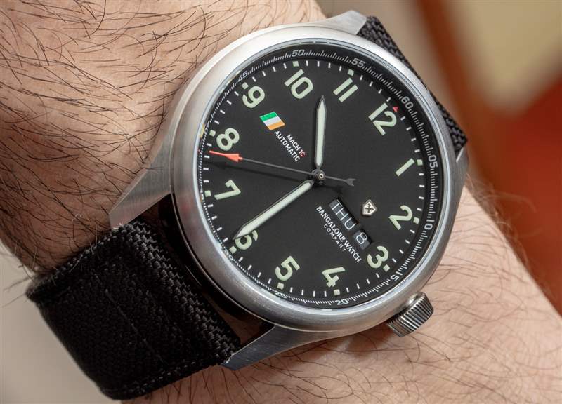 附在箱子上的是相當不錯的黑色織物表帶。我通常喜歡這些帶子在圖片中的樣子,但討厭佩戴它們,因為它們往往很僵硬并且很快磨損。班加羅爾手表公司明智地選擇了更柔軟的軟墊表帶(皮革襯里),它們比同等價格甚至更高價手表的表帶更舒適。22 毫米寬的肩帶還使用快速釋放搭扣,使它們很容易換成其他東西。另請注意,班加羅爾手表公司在表帶上選擇了定制的鋼扣,而不是使用標準的現成帶扣,這會導致更便宜的外觀。這一切都歸功于我之前所說的對細節的關注,這是該品牌的一大亮點。
