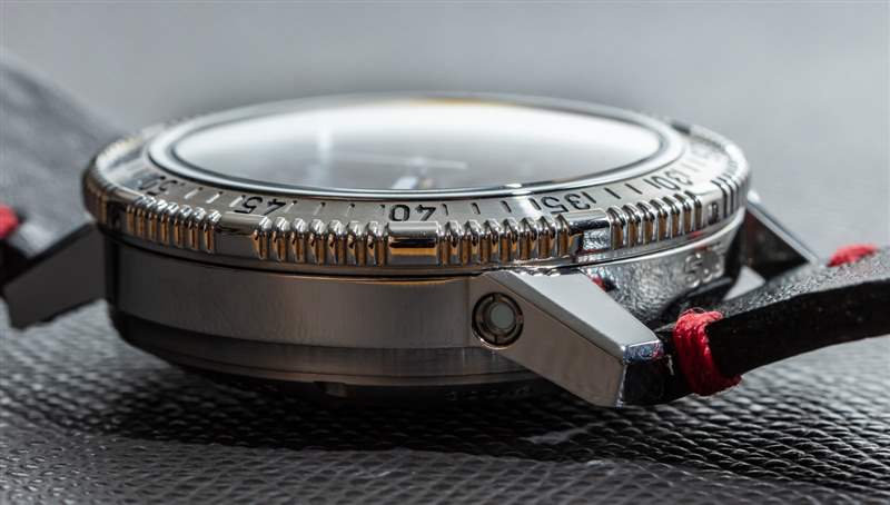 表盤周圍是操作優雅的旋轉表圈,它是鋼制的,帶有蝕刻標記和 60 分鐘標記處的夜光漆。的確,鋼比陶瓷表圈更容易劃傷和磨損,但表圈和表殼的鋼對鋼外觀既時尚又有助于這種特殊的手表設計脫穎而出。我并不是說陶瓷表圈不好——但我是說鋼表圈非常漂亮,有助于完成這款時計的經典外觀,它現在已經有 20 多年的歷史了。