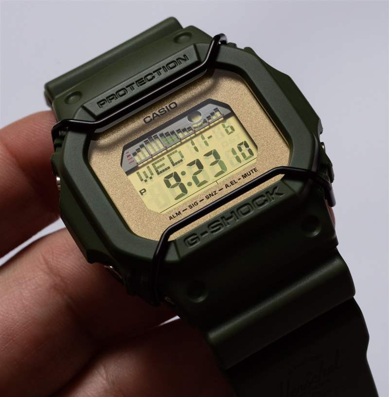 Jon Warren (JW):當卡西歐找到我們時,毫無疑問我們想要合作的手表。它必須是 G-Lide 潮汐表,因為它是具有現代氣息的經典之作。在沖浪中,“First Watch”一詞用于描述第一個到海灘檢查波浪狀況的人。我們喜歡它也具有軍事意義,并將時計的設計與軍事功能和色彩以及潮表的性能聯系起來。我們從傳統的軍用手電筒中汲取靈感,打造了這款協作時計——從黃色鏡片、表帶上的軍用規格到手表背面的雕刻,應有盡有。