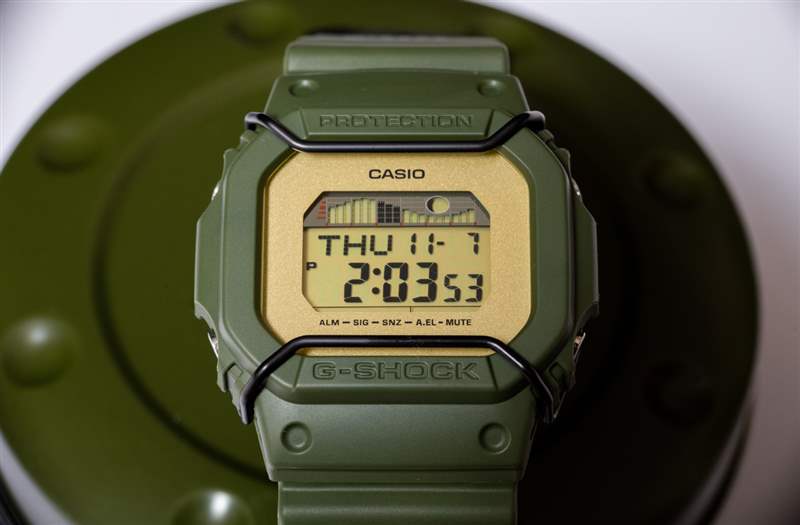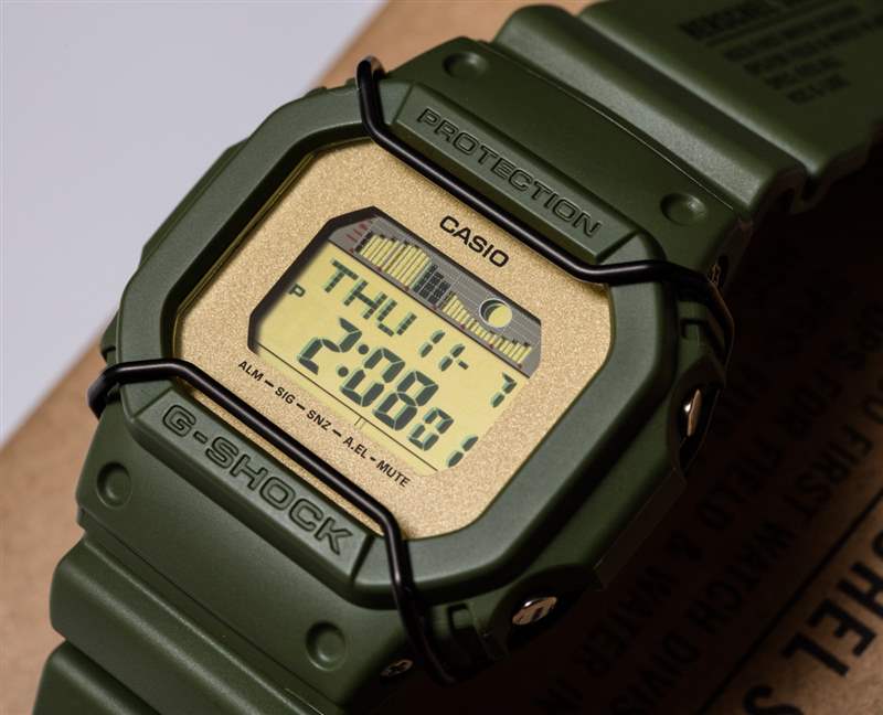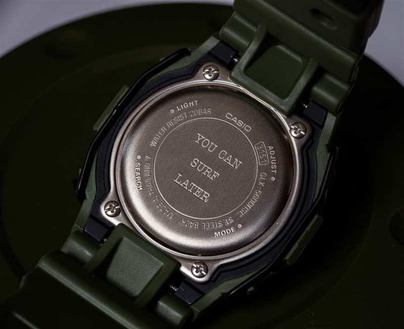 總而言之,它把自己想象成如果這些產品存在于美國退伍軍人從越南戰爭中歸來(并將他們的鐘表帶回來)的時候,G-Shock 會是什么樣子。手表的靈感實際上是一個士兵擁有的那個時代的 Zippo 打火機,它的鋼制表殼上印有“You Can Surf Later”。同樣的聲明,同樣的字體,被印在這款手表的背面,并帶有一個適合時期的字體。讀起來會讓人發笑,也有助于解釋為什么 Herschel 決定使用 G-Shock G-Lide 手表,這款手表實際上是為沖浪者設計的,表盤上有月相和潮汐圖指示。不要錯過在 1980 年代流行的外殼上逐漸“重新流行”的可拆卸金屬“屏幕保護膜”。