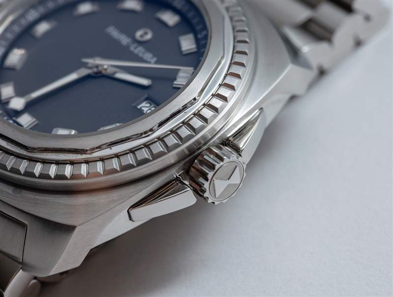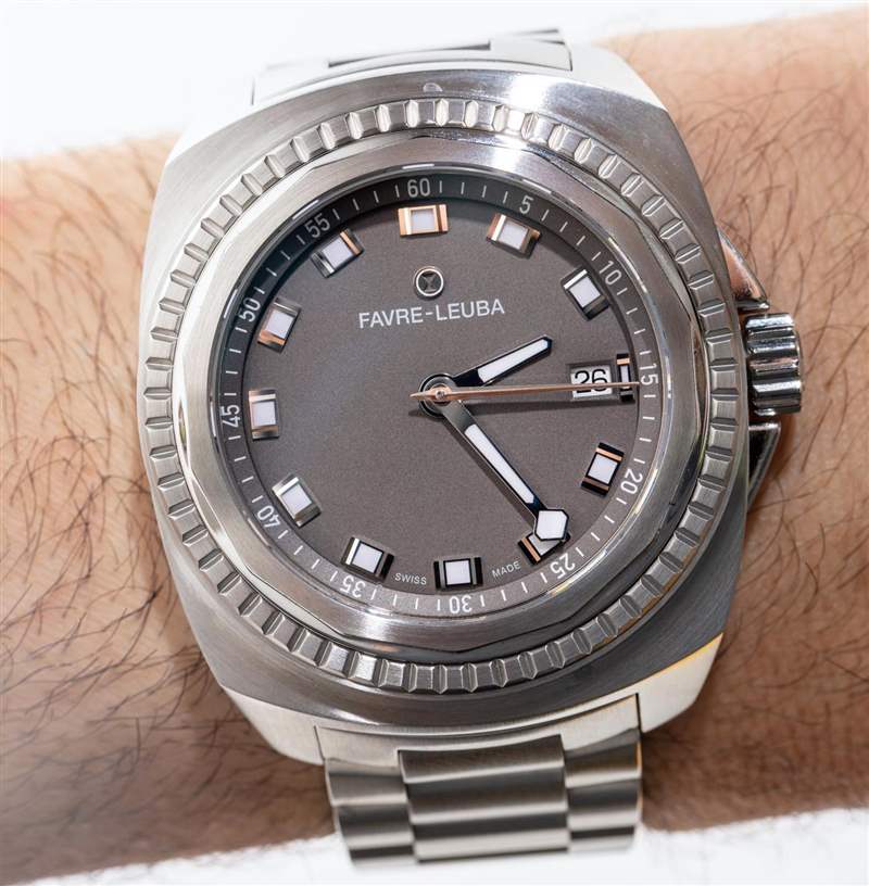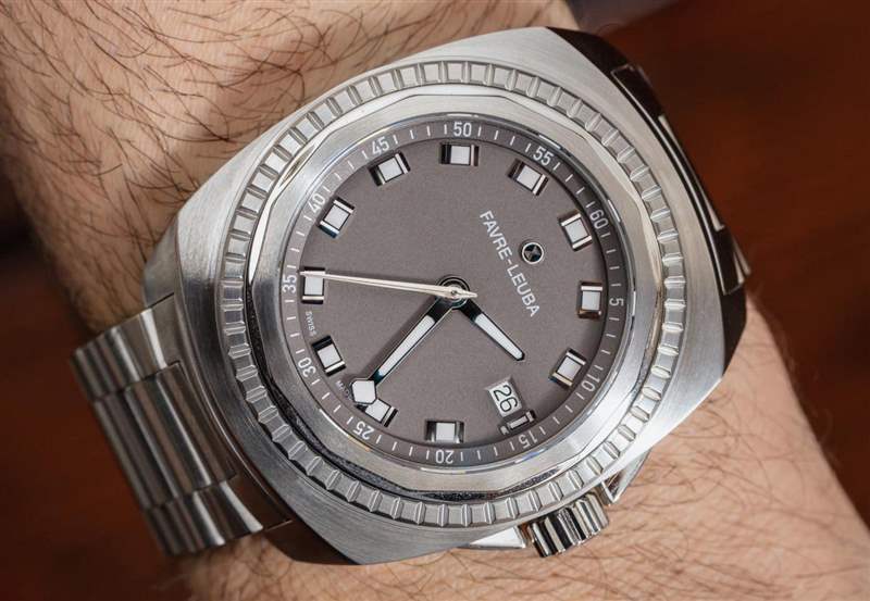 Favre-Leuba 設計的 Raider 表殼的靈感來自該品牌 1970 年代的歷史悠久的運動手表。正如我上面提到的,不銹鋼表殼是一種寬酒桶形,每一側都有一條有趣的線條,這有助于減少視覺質量。您還可以獲得拉絲和拋光表面的組合,這在表圈組件周圍的外殼頂部特別好。這也恰好是我最喜歡的手表部分,因為盡管它主要是裝飾性的,但它暗示了工具表的外觀和個性,而不僅僅是裝飾品。擋板實際上是兩個可以很好地協同工作的視覺部分。首先是水晶周圍的直接擋板,看起來有缺口,可以用扳手擰下來。接下來是外圈,看起來像是勞力士凹槽表圈的改良版。這兩種設計元素都暗示了可以旋入的組件——這是大多數防水潛水表的標志。在我看來,這是一款非常巧妙且極具吸引力的設計,適合一款外觀有趣且陽剛之??氣的時計。