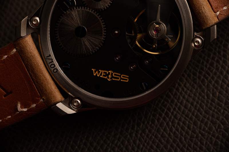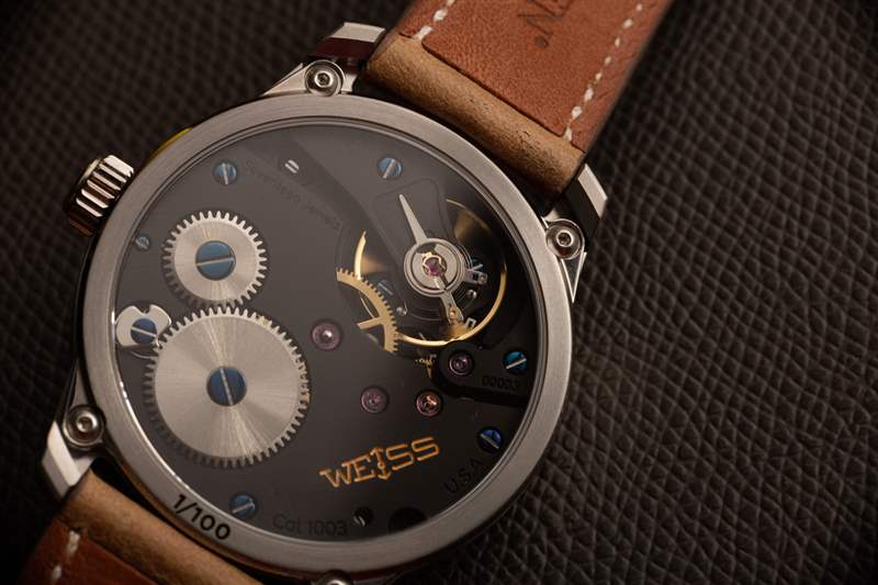 這種簡單的手動上鏈機芯被稱為 Weiss caliber 1003,它是 Cameron 喜歡使用的手動上鏈機制類型的進一步發展。除了一些專門的零件外,該機芯由 Weiss 在他位于洛杉磯的工作室制作。這種 3Hz、46 小時動力儲存的機芯架構在很久(很久)以前作為懷表機芯開始使用,并且已經多次修改和重新渲染用于手表。在這種形式下,它是 Weiss 完全獨一無二的,因此 1003 具有主要板,黑色(陽極氧化),由 7075 鋁制成。Weiss 提到了這種鋁合金是如何用于一系列航空航天應用的。廣告訊息廣告信息結束