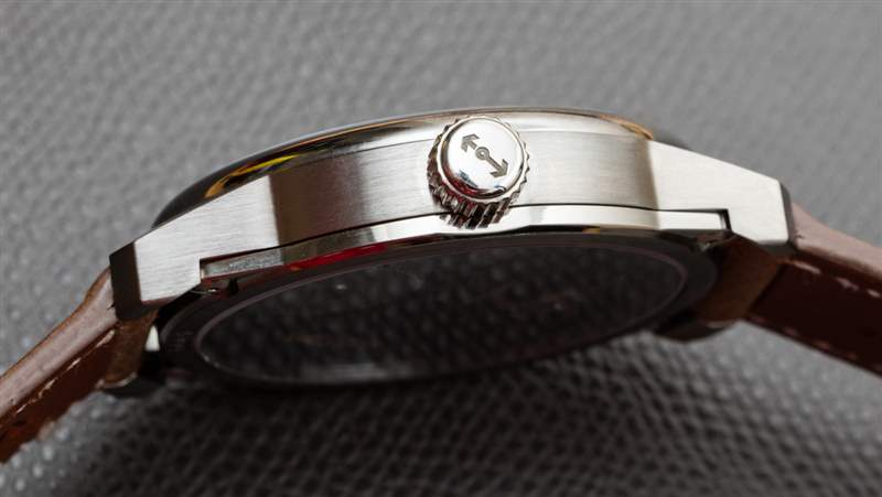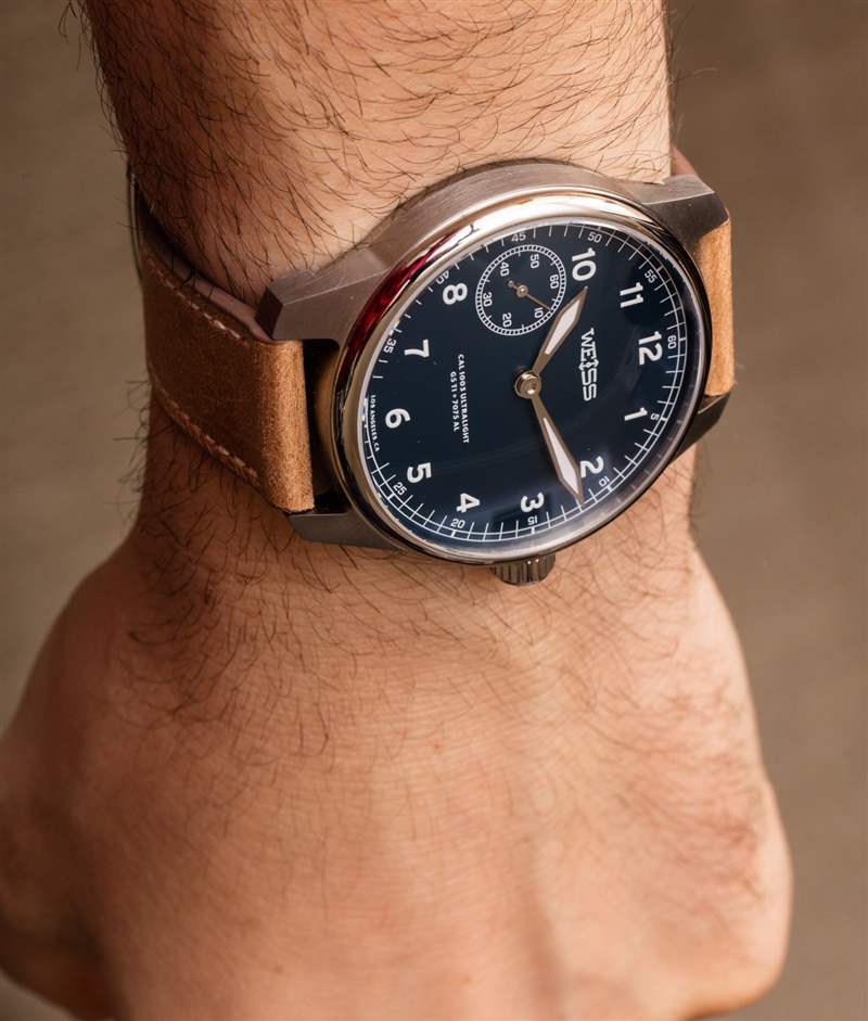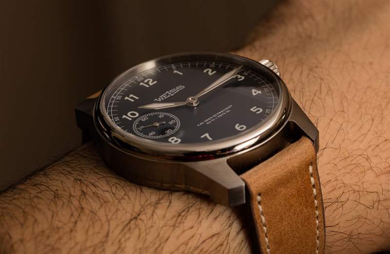Weiss 與表殼相連,搭配一條 20 毫米寬的 Horween 皮革表帶,顏色為漂亮的蜂蜜色/棕褐色。表帶很舒適,與這個價位和款式的手表應有的水平相當。我要避免的是過于僵硬的肩帶——謝天謝地,這不是其中之一。
