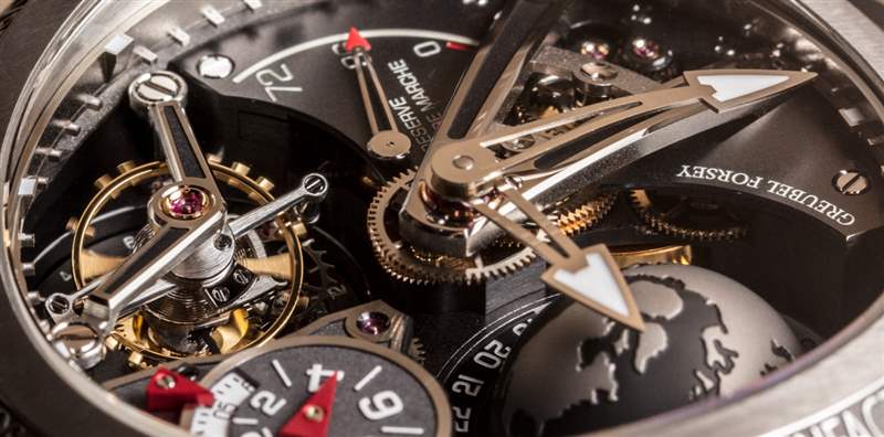 GMT Sport 內(nèi)部是現(xiàn)有機(jī)芯的新版本:Greubel Forsey GMT 陀飛輪。該機(jī)芯包括一個(gè)以 25 度傾斜角安裝的陀飛輪(每 24 秒旋轉(zhuǎn)一次),以及時(shí)間、動(dòng)力儲(chǔ)存指示器、日/夜 (AM/PM) 指示器和 GMT 指示器。后一種功能使用表盤上的半球形,優(yōu)雅地翻轉(zhuǎn)一天,以及12小時(shí)指示器和表殼后部的移動(dòng)圓盤。如您所見,GMT Sport 的首發(fā)版本將有一個(gè)“黑色地球”,而 GMT Sport 的后續(xù)首批型號(hào)將有一個(gè)更傳統(tǒng)的藍(lán)色地球。黑色地球模型將作為非常有限的套裝生產(chǎn)(如果我沒記錯(cuò)的話,大概有 5 到 10 件)。廣告訊息廣告信息結(jié)束