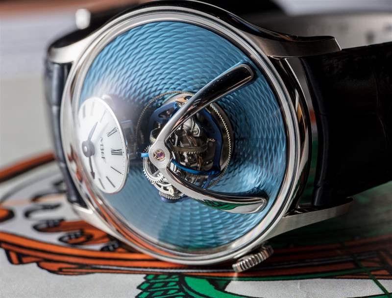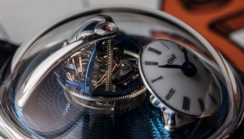 Thunderdome 內部的手動上鏈機械機芯既復雜又涼爽。波特式調節系統由 413 個零件制成,以 3Hz 的頻率運行,該機構在三個主發條盒之間具有 45 小時的動力儲存(非常耗電的機芯)。手表的表盤僅以小時和分鐘指示時間(沒有傳統的秒指示),動力儲存指示器位于機芯上,可從表殼后部看到。該機芯的一個有趣技巧是使用齒輪裝置來操作手表表面的時間傾斜表盤。