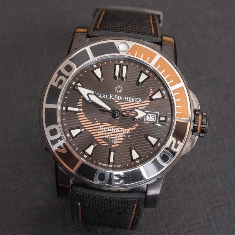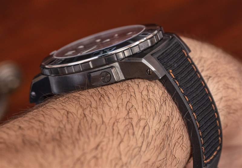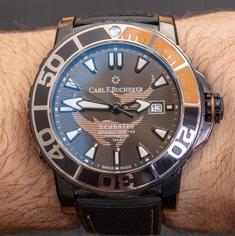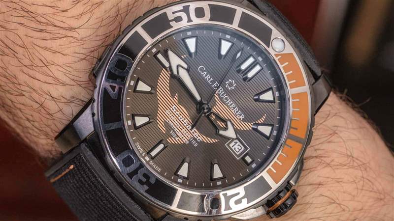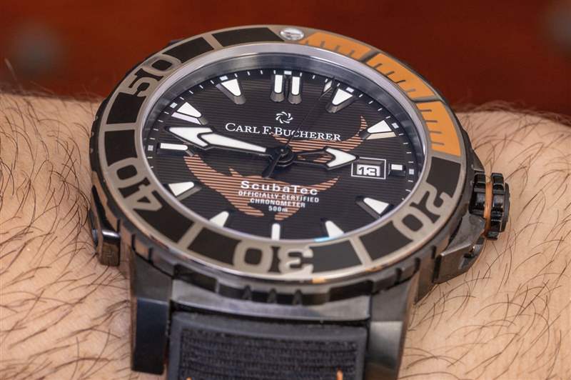 這也是卡爾第一次。F Bucherer 用鈦(相對于鋼)制造了它的 ScubaTec——不僅僅是鈦,還有黑色 DLC 涂層鈦。這不僅具有出色的外觀,而且還具有耐刮擦性,這是一個受歡迎的補充。表殼可防水 500 米,帶有自動排氦閥,寬 44.6 毫米,厚約 13.4 毫米。它實際上佩戴起來非常舒適,尤其是在橡膠表帶上。我也喜歡這款手表整體上相對緊湊,適合 500 米潛水員的時計。廣告訊息廣告信息結束