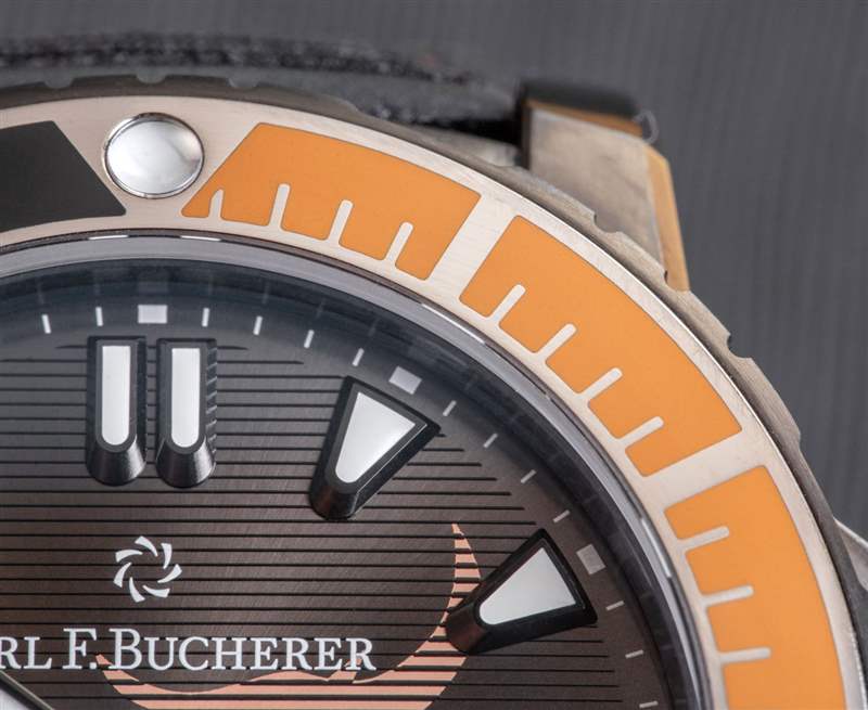 表盤周圍是旋轉的金屬潛水表圈,但帶有陶瓷鑲嵌物。包括數字在內的拋光表面是一個有趣的設計特征,看起來不像其他瑞士潛水員。表圈的鑲嵌顏色是黑色和一種古銅色/焦橙色,帥氣而有特色。同樣的青銅色用于表盤上的游泳蝠鲼圖案。我真的很喜歡這種藝術元素,因為它暗示了手表的主題,清楚地暗示了潛水,而且不會分散人們閱讀指針的能力。說到指針和時標,Carl F. Bucherer 決定也將它們涂成黑色,這樣可以提供漂亮的外觀以及大量的發光體。總體而言,表盤既獨特又非常易于閱讀。