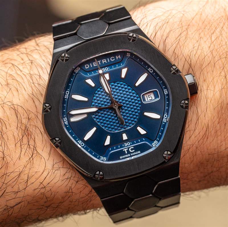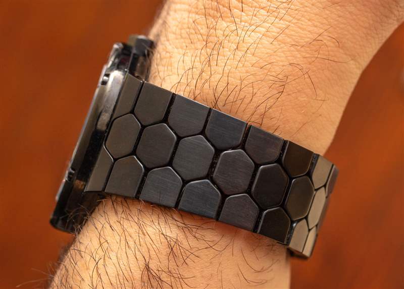加上表冠,TC 鋼制表殼寬 46.2 毫米,沒有表冠,表殼寬 43.8 毫米,厚度僅為 9.3 毫米。考慮到與表殼的喇叭形側面相比,表耳變得狹窄,它實際上磨損了一點。在這里,我們看到迪特里希再次嘗試使用六邊形主題。這款腕表采用定制的藍寶石水晶表鏡和全鋼表殼和表鏈,重約 166 克,具??有 50 米防水深度和旋入式表冠。
