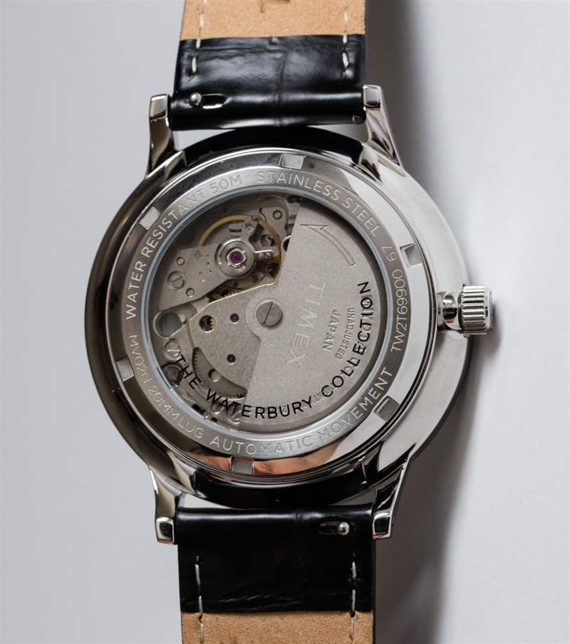 Timex 生產(chǎn)了幾個版本的 Waterbury Classic Automatic,包括這個灰白色表盤和一個黑色表盤。有一些表殼和表帶/手鏈可供選擇,包括網(wǎng)眼金屬米蘭式手鏈(僅比皮革表帶貴 10 美元)。