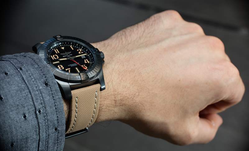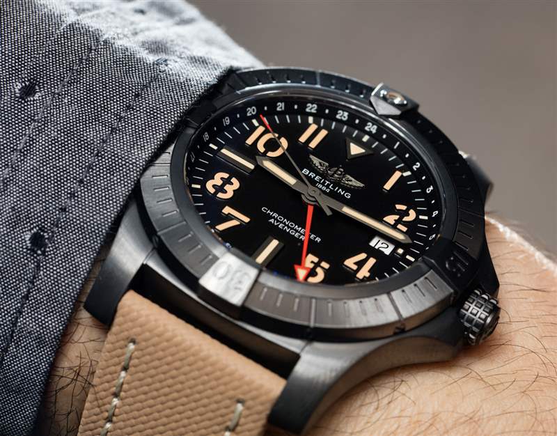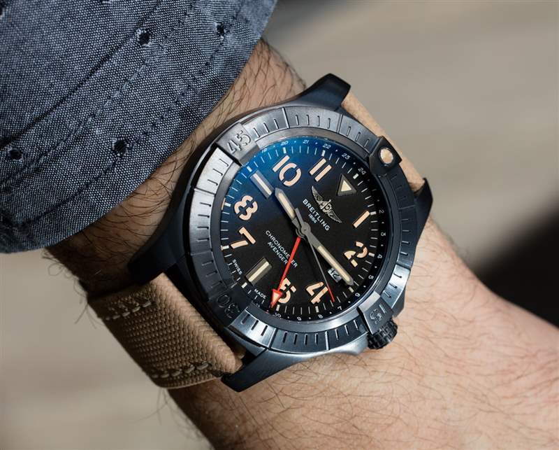 作為 GMT 手表,這些都是好看的時計,藍盤標準精鋼版本和軍用風格 Night Mission 上的紅色 GMT 指針非常容易閱讀,不容易與時針或分針混淆。另一方面,24 小時刻度有點小,需要良好的眼睛。這確實意味著單向旋轉表圈仍然可以用于 60 分鐘計時器——老實說,這對于這種血統的 GMT 手表來說是罕見的。此外,還有需要應對的表殼尺寸,這將使 Avenger Automatic GMT 45 手表對于很多手腕來說太大了。未來百年靈完全有可能在較小的情況下制作更多版本。