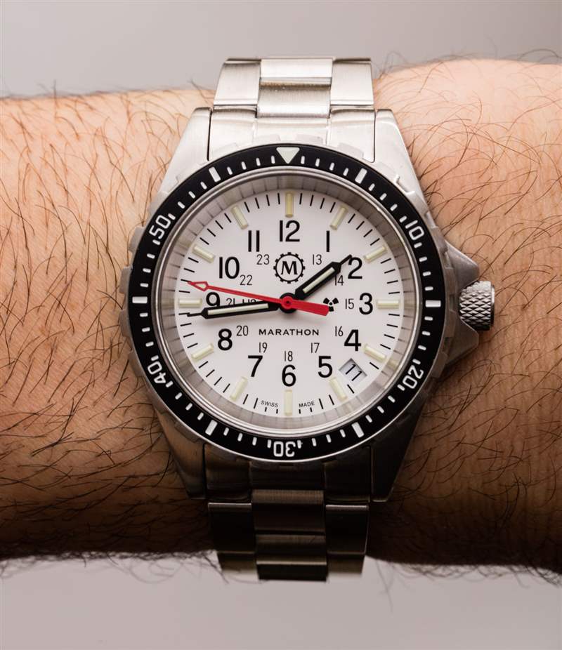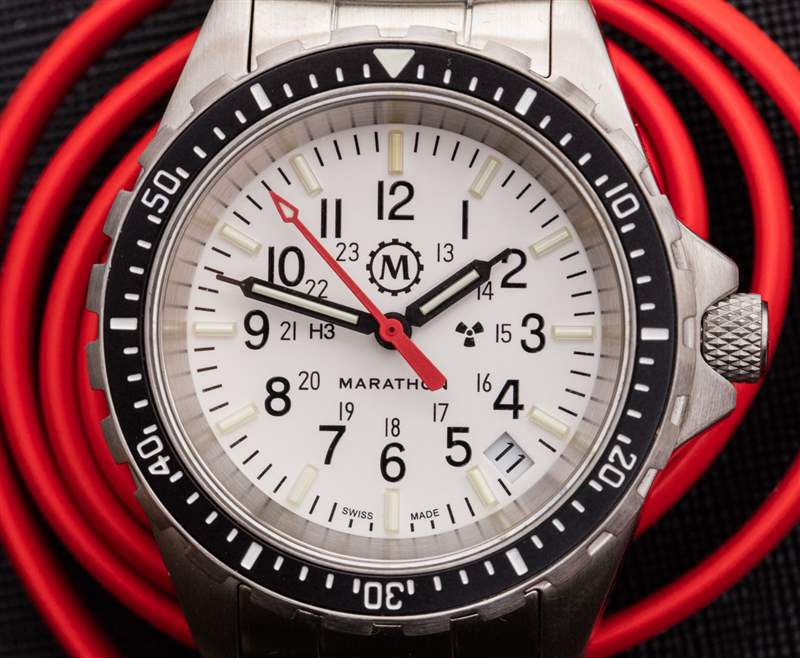 這是軍事供應(yīng)商和手表制造商馬拉松生產(chǎn)的第一款同類白表盤手表。我最近參觀了馬拉松在加拿大多倫多的總部,發(fā)現(xiàn)該公司的負(fù)責(zé)人正自豪地佩戴著這款手表的原型。“你知道,這是我們制作的第一個(gè)這樣的白色表盤,”第三代 Marathon 老板 Mitchel Wein 說。Medium Diver’s Quartz(也常被稱為 TSAR,或“氚搜救表”)是 Marathon 生產(chǎn)的一款有趣且非常實(shí)用的“工具表”,它繼續(xù)為美國、英國、加拿大和其他軍隊(duì)提供時(shí)計(jì)軍隊(duì)。最近,Marathon 做出了一項(xiàng)重要決定,為其鐘表系列增添趣味,同時(shí)確保 Marathon 手表一如既往地耐用和實(shí)用。