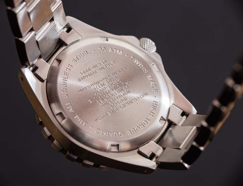 搭配相配的 316L 不銹鋼表鏈(您也可以在黑色橡膠表帶上購買)也可以幫助手表呈現(xiàn)最佳外觀。雖然您可以在 Marathon Medium Diver 的 Quartz Ghostbuster 上放置任意數(shù)量的 18 毫米寬的表帶,但我認(rèn)為三連桿拉絲鋼表鏈看起來最帥氣。手鐲不僅具有迷人的錐形(重要的視覺觸感),而且還使用厚實(shí)的螺釘來固定鏈節(jié)。但是請注意,要確定手鐲的尺寸,您需要在螺絲的兩側(cè)使用螺絲刀——這意味著可能需要一些特殊工具。手鐲有一個(gè)折疊式展開式表扣,有點(diǎn)“上一代”,但可以完成工作。如果您需要將手表戴在大夾克或潛水服上,它還具有折疊式潛水員的延伸部分。