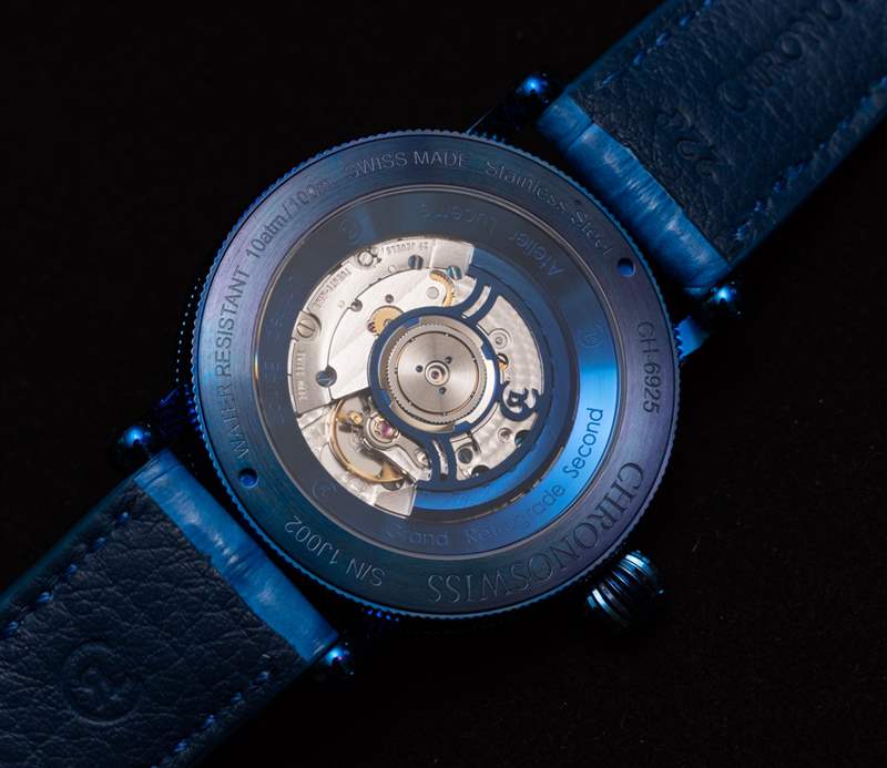 手表內(nèi)部是自動(dòng)上鏈機(jī)芯 C.301,它以 ETA 2892-A2 的形式開始使用,并帶有 Chronoswiss 專利模塊,用于調(diào)節(jié)器式時(shí)間顯示和逆跳秒指示器。您可以在整個(gè)年份查看 4Hz、大約 42 小時(shí)動(dòng)力儲(chǔ)存的機(jī)芯……當(dāng)然,它還有一個(gè)匹配的藍(lán)色涂層自動(dòng)轉(zhuǎn)子。44 毫米寬的 Flying Grand Regulator Open Gear ReSec 表殼本身很舒適(假設(shè)您的手腕可以拉出較長(zhǎng)的表耳)并且防水深度達(dá) 100 米。