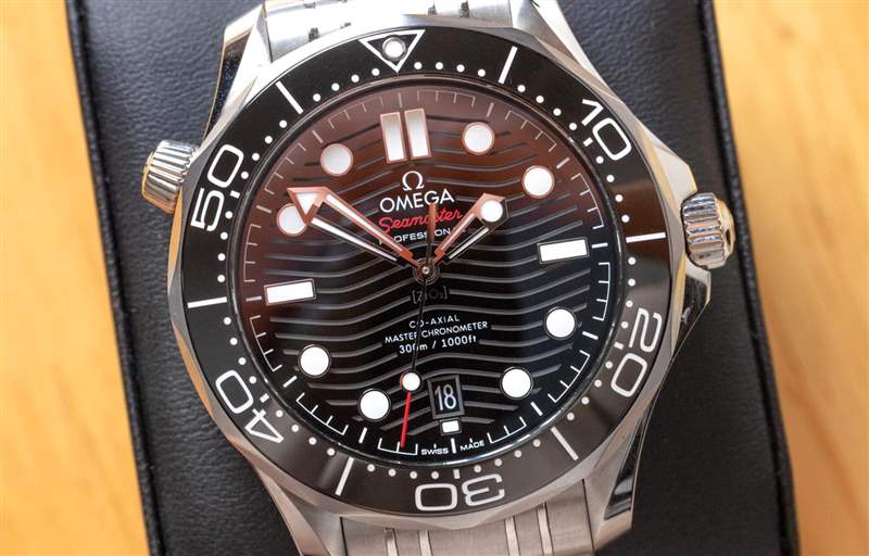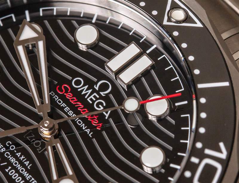 黑色陶瓷表盤具有水平波浪圖案,讓人聯(lián)想到原始 Seamaster 300M 手表表盤的外觀。幾年前更新的歐米茄海馬 300M 手表表盤上沒有波浪,提供了在市場上表現(xiàn)良好的新鮮外觀。為了保持一致性并幫助展示表盤上整潔的激光蝕刻,新款海馬 300M 手表為全新一代帶回了表盤波浪。