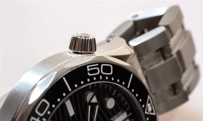 最新一代的海馬 300M 手表比上一代略大,表殼寬 42 毫米,表殼寬 41 毫米。防水深度達(dá) 300 米,表殼厚約 12 毫米,表耳到表耳的距離約為 50 毫米。佩戴舒適度很高,但它是一款笨重的手表——尤其是與金屬表鏈搭配時。對表殼進(jìn)行的最有趣但微妙的更新之一是位于表殼 10 點鐘位置的氦釋放閥表冠的錐形化。這種輕微的設(shè)計調(diào)整是一種在視覺上區(qū)分新舊海馬 300M 型號的快速方法。