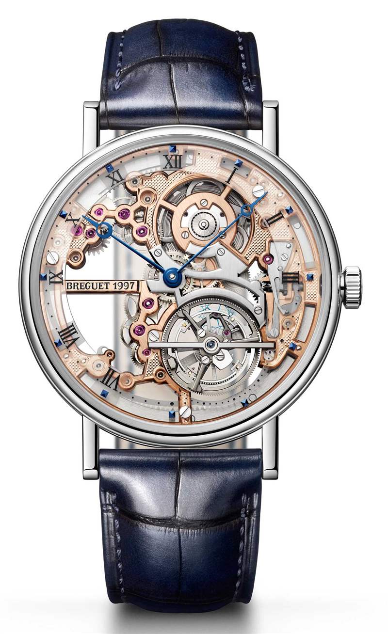 寶璣Classique Tourbillon Extra-Plat Squelette 5395 如此可穿戴的原因在于其重量輕且厚度為7.7 毫米的相當(dāng)薄的表殼。表殼寬 41 毫米,防水深度達(dá) 30 米,夾在藍(lán)寶石水晶中。表殼有“直立的凸耳”,可以延伸到小手腕的邊緣。請注意,這本身并不是一個新的表殼和機(jī)芯,而是Classique Tourbillon Extra-Plat 第一次被呈現(xiàn)為骨架。