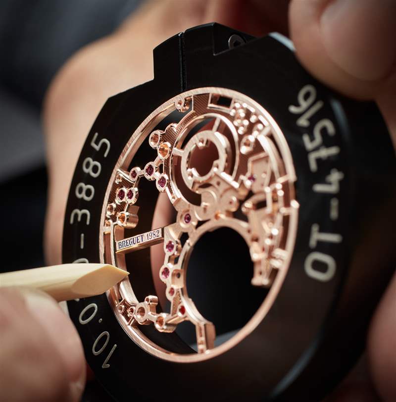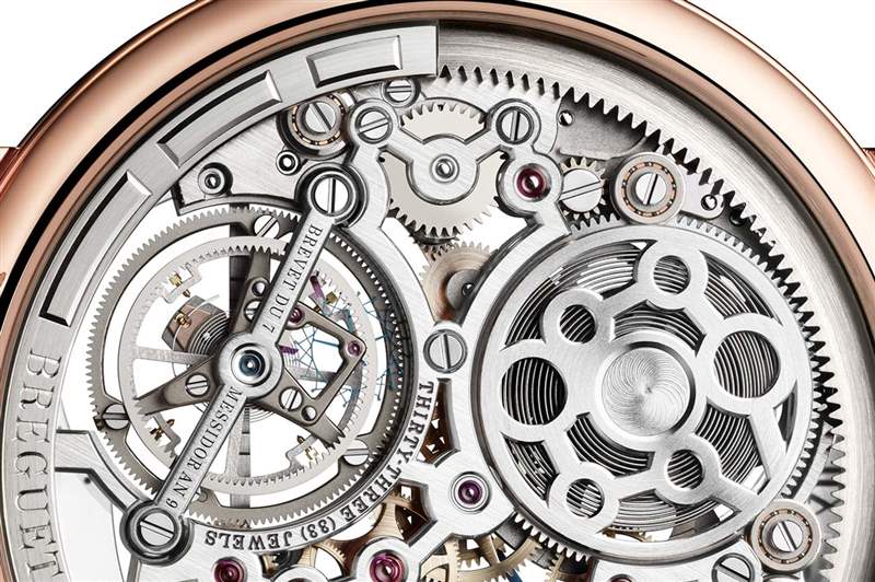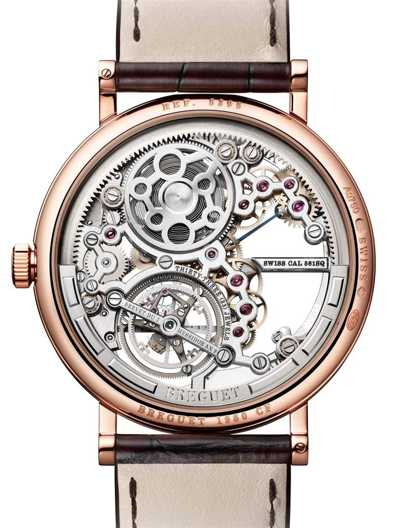 機(jī)芯 581(此處為 581SQ)的鏤空是一件藝術(shù)品,還需要巧妙地保留機(jī)芯架構(gòu)的精致基礎(chǔ)設(shè)施。從鏤空主發(fā)條發(fā)條盒的有趣設(shè)計到一些外露橋板上的扭索雕花雕刻,這一切都展示了這件可愛藝術(shù)品的大部分表面上的極其細(xì)致的努力和工作。盡管經(jīng)過大量的拋光、雕刻和塑造,Classique Tourbillon Extra-Plat Squelette 5395 仍然具有陽剛之氣以及熟悉的古典主義。